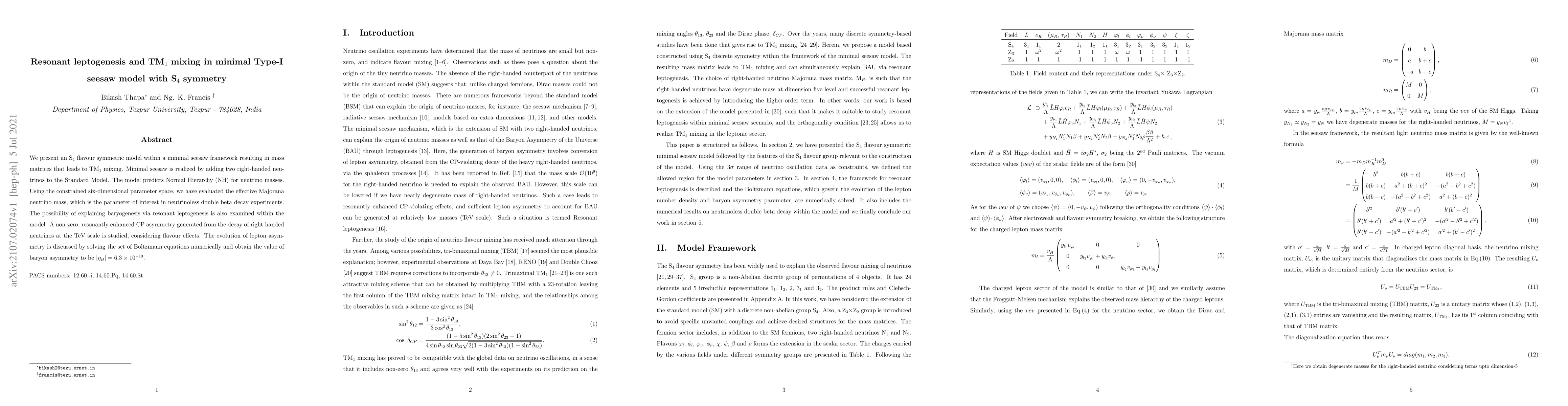 We present an S$_4$ flavour symmetric model within a minimal seesaw framework resulting in mass matrices that leads to TM$_1$ mixing. Minimal seesaw is realized by adding two right-handed neutrinos to the Standard Model. The model predicts Normal Hierarchy (NH) for neutrino masses. Using the constrained six-dimensional parameter space, we have evaluated the effective Majorana neutrino mass, which is the parameter of interest in neutrinoless double beta decay experiments. The possibility of explaining baryogenesis via resonant leptogenesis is also examined within the model. A non-zero, resonantly enhanced CP asymmetry generated from the decay of right-handed neutrinos at the TeV scale is studied, considering flavour effects. The evolution of lepton asymmetry is discussed by solving the set of Boltzmann equations numerically and obtain the value of baryon asymmetry to be $\lvert \eta_B \rvert = 6.3 \times 10^{-10}$.