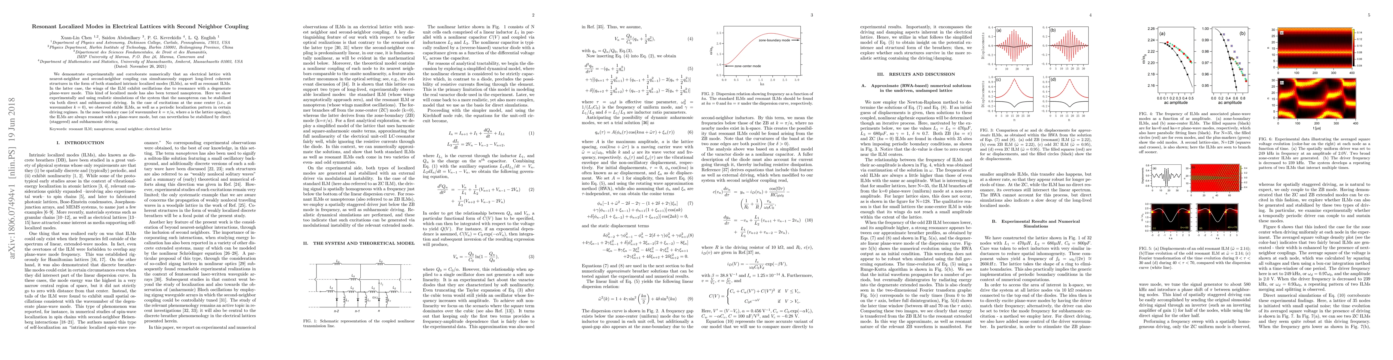 We demonstrate experimentally and corroborate numerically that an electrical lattice with nearest-neighbor and second-neighbor coupling can simultaneously support long-lived coherent structures in the form of both standard intrinsic localized modes (ILMs), as well as resonant ILMs. In the latter case, the wings of the ILM exhibit oscillations due to resonance with a degenerate plane-wave mode. This kind of localized mode has also been termed nanopteron. Here we show experimentally and using realistic simulations of the system that the nanopteron can be stabilized via both direct and subharmonic driving. In the case of excitations at the zone center (i.e., at wavenumber $k=0$), we observed stable ILMs, as well as a periodic localization pattern in certain driving regimes. In the zone boundary case (of wavenumber $k=\pi/a$, where $a$ is the lattice spacing), the ILMs are always resonant with a plane-wave mode, but can nevertheless be stabilized by direct (staggered) and subharmonic driving.