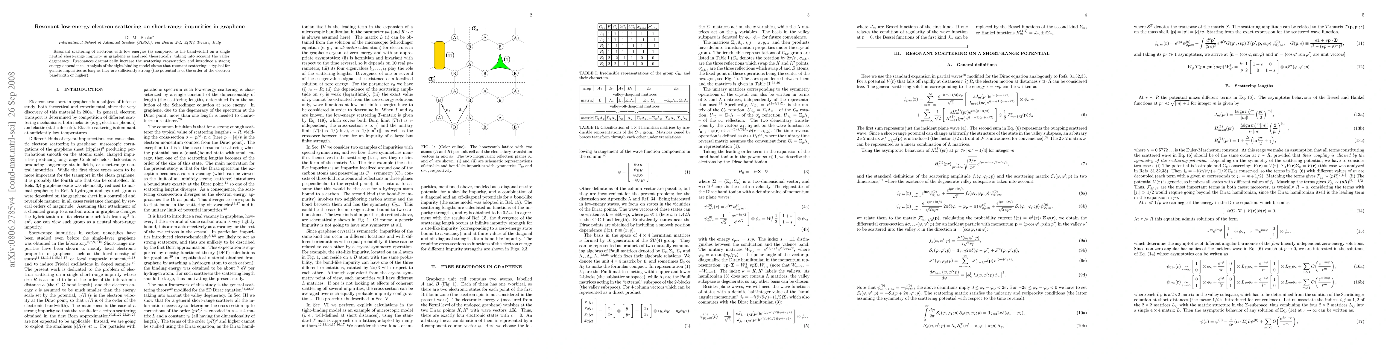 This paper theoretically analyzes resonant low-energy electron scattering in graphene due to neutral short-range impurities, highlighting significant cross-section increases and strong energy dependence, typical for strong enough impurities relative to the electron bandwidth. The study utilizes a tight-binding model considering valley degeneracy.