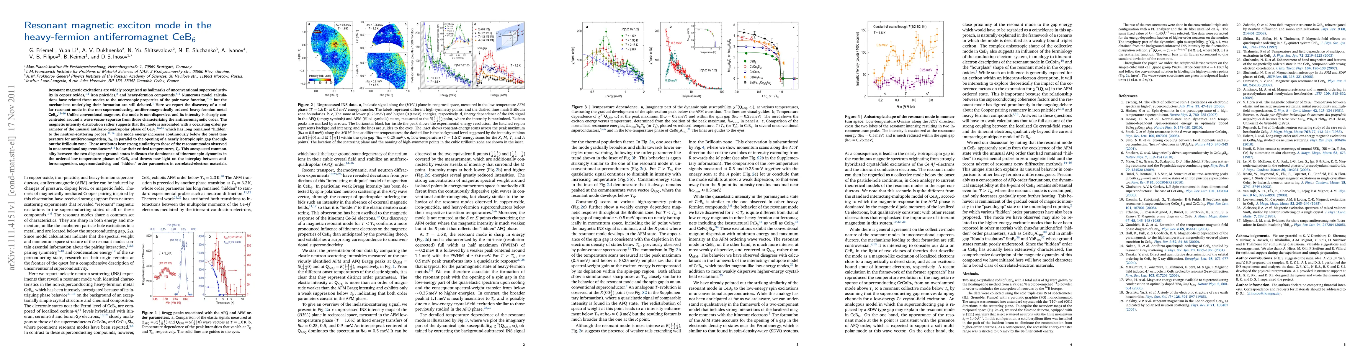 This paper reports the discovery of a resonant magnetic exciton mode in the heavy-fermion antiferromagnet CeB6, which is non-dispersive and linked to an unusual antiferro-quadrupolar phase. The findings suggest a strong connection between itinerant spin dynamics and the ordered low-temperature phases, highlighting the interplay between antiferromagnetism, superconductivity, and hidden order parameters in correlated-electron materials.