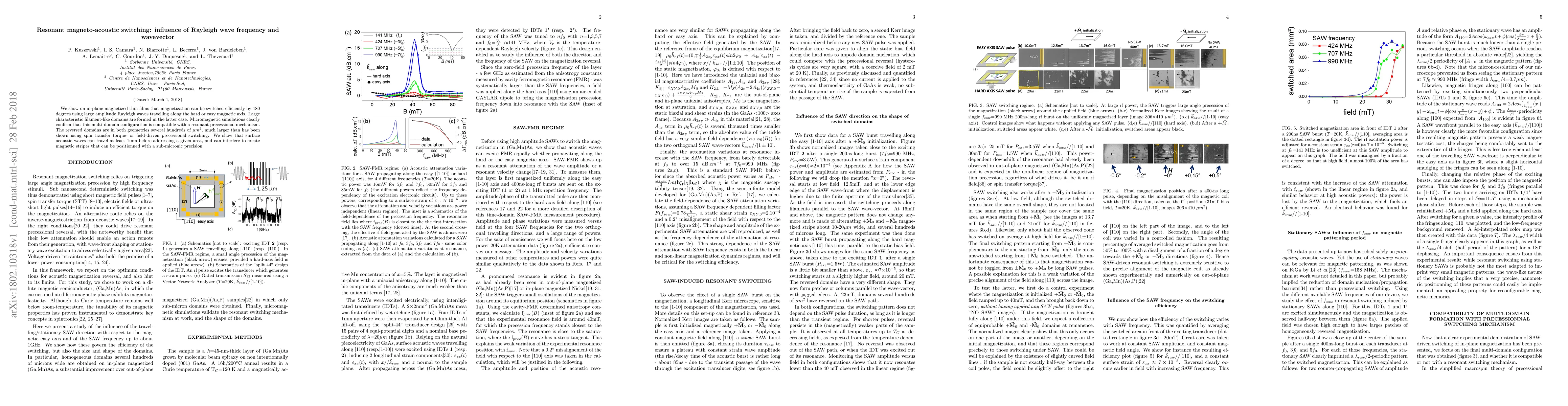 We show on in-plane magnetized thin films that magnetization can be switched efficiently by 180 degrees using large amplitude Rayleigh waves travelling along the hard or easy magnetic axis. Large characteristic filament-like domains are formed in the latter case. Micromagnetic simulations clearly confirm that this multi-domain configuration is compatible with a resonant precessional mechanism. The reversed domains are in both geometries several hundreds of \mu m^2, much larger than has been shown using spin transfer torque- or field-driven precessional switching. We show that surface acoustic waves can travel at least 1mm before addressing a given area, and can interfere to create magnetic stripes that can be positionned with a sub-micronic precision.