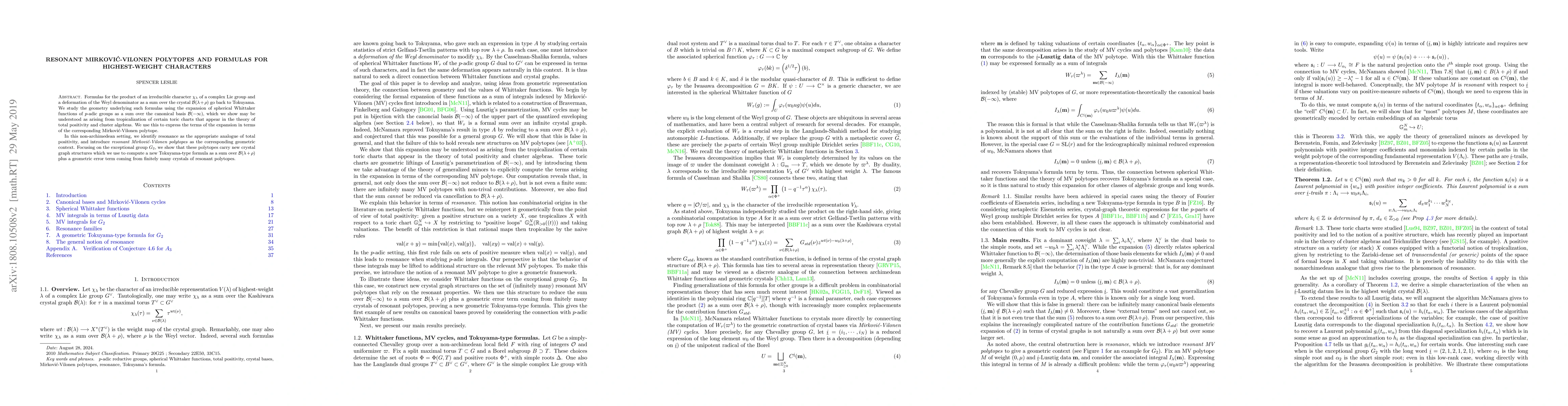 Formulas for the product of an irreducible character $\chi_\lambda$ of a complex Lie group and a deformation of the Weyl denominator as a sum over the crystal $\mathcal{B}(\lambda+\rho)$ go back to Tokuyama. We study the geometry underlying such formulas using the expansion of spherical Whittaker functions of $p$-adic groups as a sum over the canonical basis $\mathcal{B}(-\infty)$, which we show may be understood as arising from tropicalization of certain toric charts that appear in the theory of total positivity and cluster algebras. We use this to express the terms of the expansion in terms of the corresponding Mirkovi\'{c}-Vilonen polytope. In this non-archimedean setting, we identify resonance as the appropriate analogue of total positivity, and introduce \emph{resonant Mirkovi\'{c}-Vilonen polytopes} as the corresponding geometric context. Focusing on the exceptional group $G_2$, we show that these polytopes carry new crystal graph structures which we use to compute a new Tokuyama-type formula as a sum over $\mathcal{B}(\lambda+\rho)$ plus a geometric error term coming from finitely many crystals of resonant polytopes.