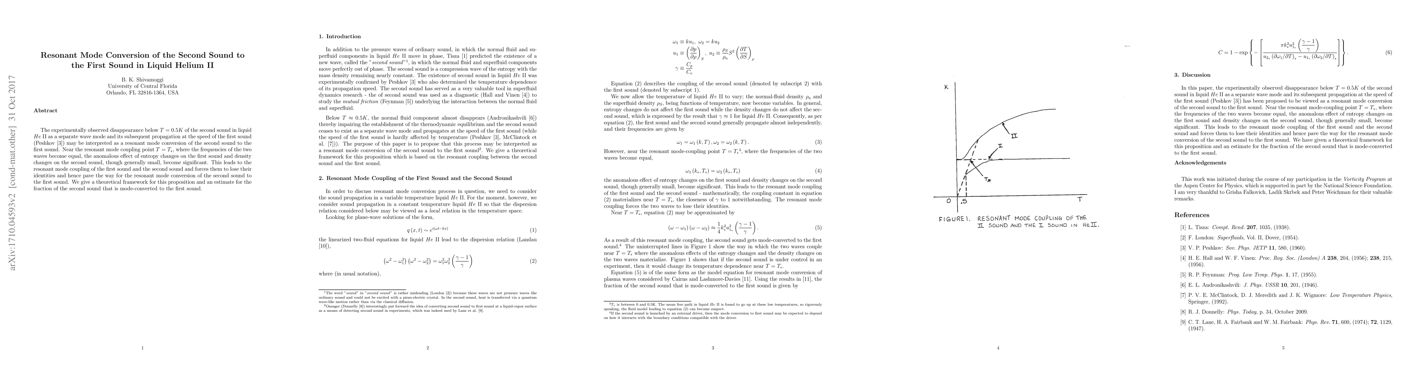The paper proposes a theoretical framework explaining the resonant mode conversion of second sound to first sound in liquid Helium II below 0.5K, attributing the phenomenon to resonant coupling near a critical temperature where frequencies of the two sound modes align, leading to significant entropy and density effects. An estimate of the converted second sound fraction is provided.