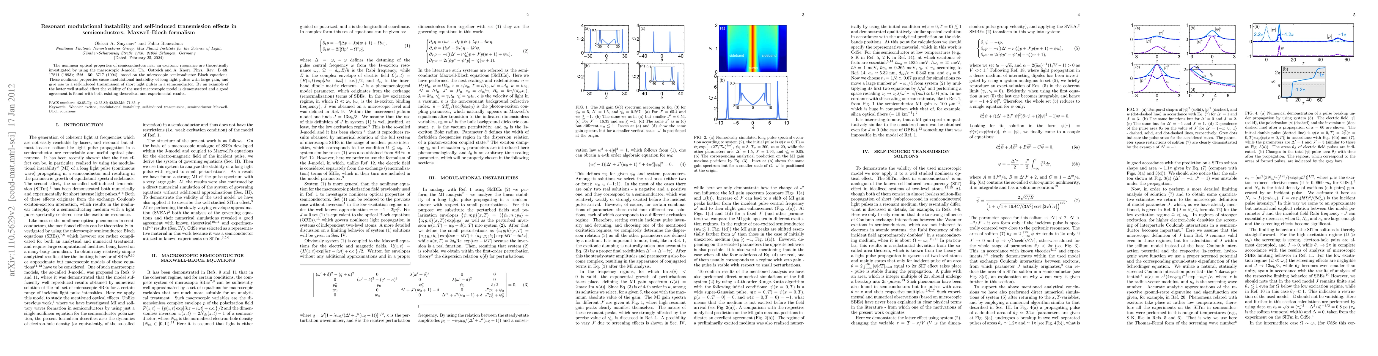 The study investigates nonlinear optical properties of semiconductors near excitonic resonance using a macroscopic model, finding modulational instability in long pulses and self-induced transmission in short pulses, with good agreement with existing results.