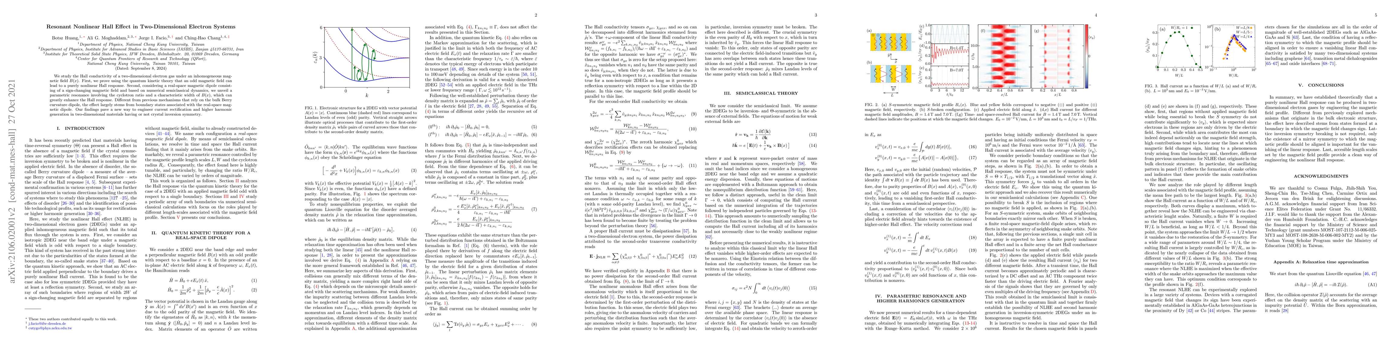 We study the Hall conductivity of a two-dimensional electron gas under an inhomogeneous magnetic field $B(x)$. First, we prove using the quantum kinetic theory that an odd magnetic field can lead to a purely nonlinear Hall response. Second, considering a real-space magnetic dipole consisting of a sign-changing magnetic field and based on numerical semiclassical dynamics, we unveil a parametric resonance involving the cyclotron ratio and a characteristic width of $B(x)$, which can greatly enhance the Hall response. Different from previous mechanisms that rely on the bulk Berry curvature dipole, here, the effect largely stems from boundary states associated with the real-space magnetic dipole. Our findings pave a new way to engineer current rectification and higher harmonic generation in two-dimensional materials having or not crystal inversion symmetry.