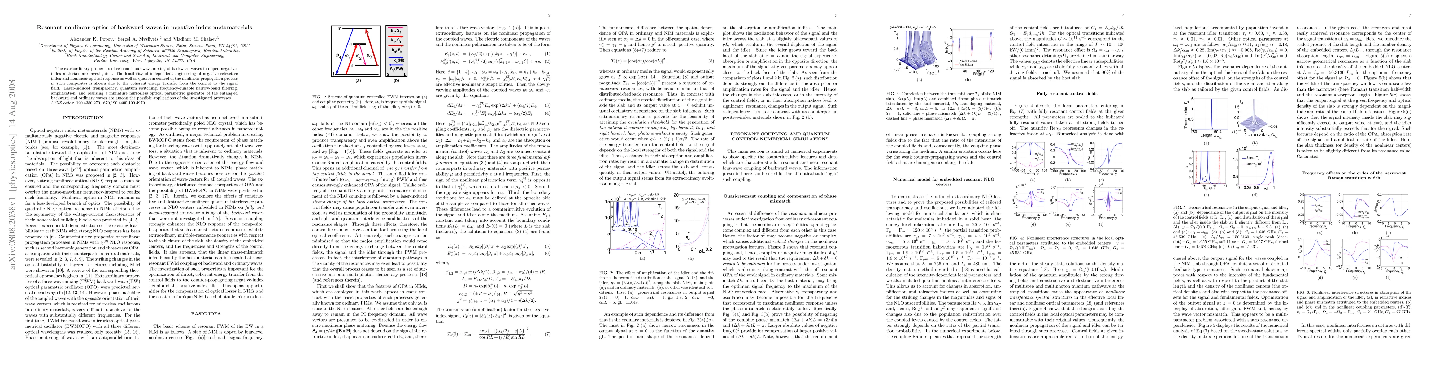This paper explores the resonant nonlinear optics of backward waves in negative-index metamaterials, demonstrating the independent engineering of negative refractive index and nonlinear optical response, with potential applications including laser-induced transparency, quantum switching, and frequency-tunable filtering. The study highlights the coherent energy transfer and quantum control of nonlinear propagation processes.
