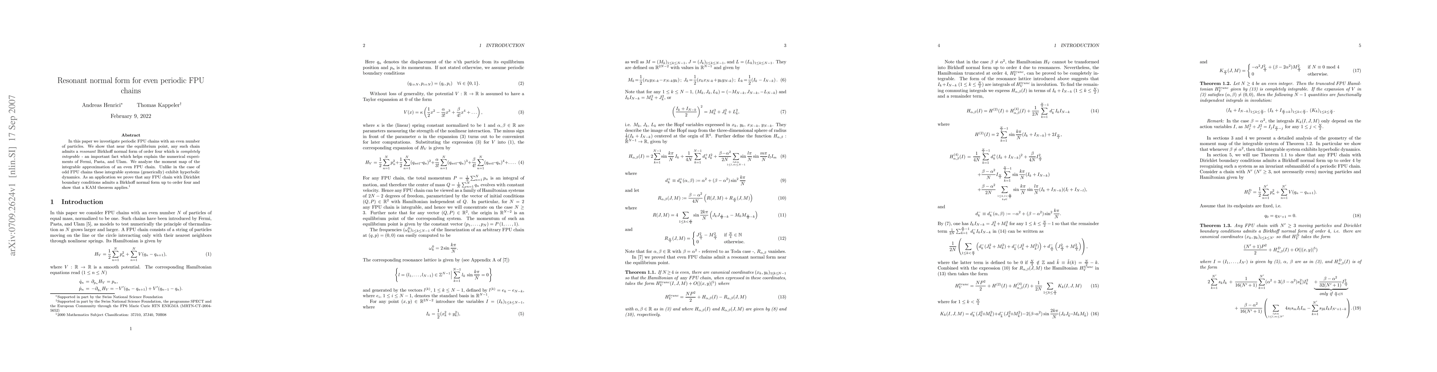 In this paper we investigate periodic FPU chains with an even number of particles. We show that near the equilibrium point, any such chain admits a \emph{resonant} Birkhoff normal form of order four which is \emph{completely integrable} - an important fact which helps explain the numerical experiments of Fermi, Pasta, and Ulam. We analyze the moment map of the integrable approximation of an even FPU chain. Unlike in the case of odd FPU chains these integrable systems (generically) exhibit hyperbolic dynamics. As an application we prove that any FPU chain with Dirichlet boundary conditions admits a Birkhoff normal form up to order four and show that a KAM theorem applies.