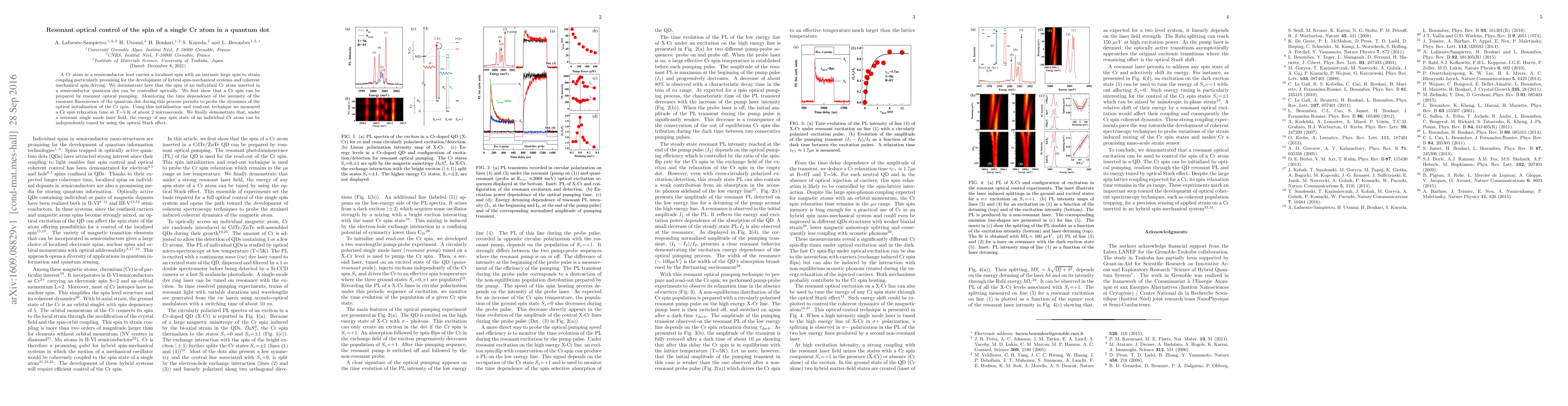 This paper demonstrates optical control of the spin of a single Cr atom in a semiconductor quantum dot using resonant optical pumping and the optical Stark effect. The study reveals a spin relaxation time of about 2 microseconds at 5 K and shows the potential for hybrid spin-mechanical systems.