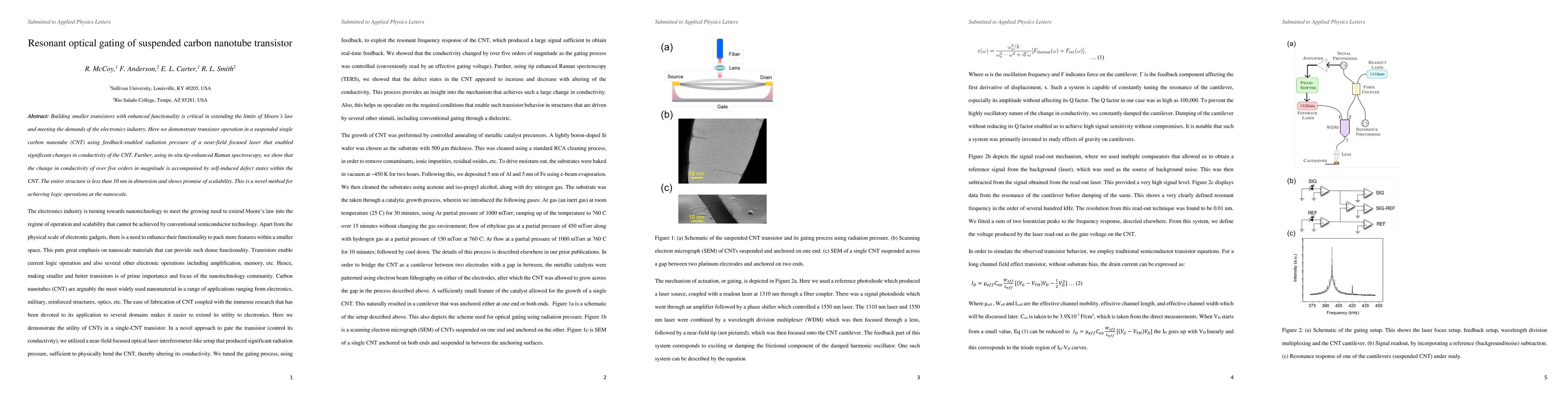 Building smaller transistors with enhanced functionality is critical in extending the limits of Moores law and meeting the demands of the electronics industry. Here we demonstrate transistor operation in a suspended single carbon nanotube (CNT) using feedback-enabled radiation pressure of a near-field focused laser that enabled significant changes in conductivity of the CNT. Further, using in-situ tip-enhanced Raman spectroscopy, we show that the change in conductivity of over five orders in magnitude is accompanied by self-induced defect states within the CNT. The entire structure is less than 10 nm in dimension and shows promise of scalability. This is a novel method for achieving logic operations at the nanoscale.