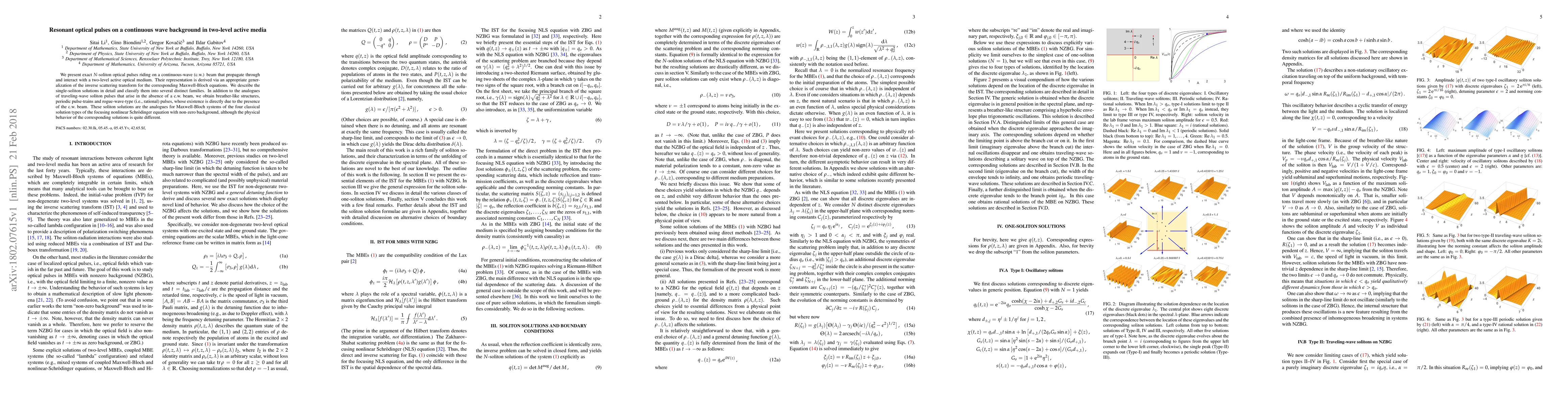 The paper presents exact optical pulse solutions, including solitons, breathers, periodic pulse-trains, and rogue-wave pulses, propagating through a continuous-wave beam in a two-level active medium. These solutions are derived using a generalized inverse scattering transform for Maxwell-Bloch equations, revealing four distinct soliton families analogous to those in the nonlinear Schrödinger equation with non-zero background.