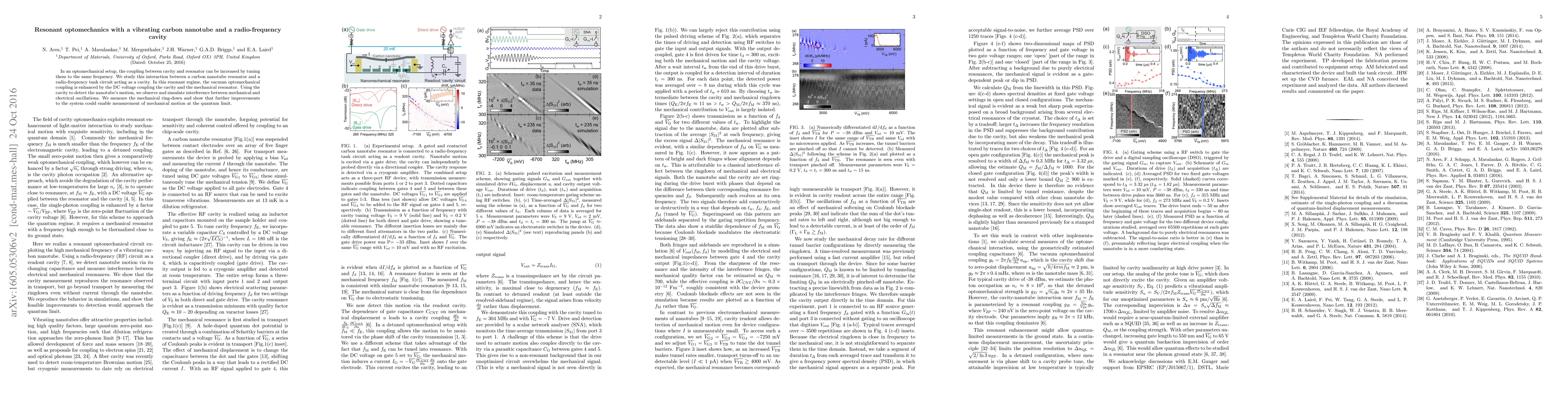 In an optomechanical setup, the coupling between cavity and resonator can be increased by tuning them to the same frequency. We study this interaction between a carbon nanotube resonator and a radio-frequency circuit. In this resonant regime, the vacuum optomechanical coupling is enhanced by the DC voltage coupling the cavity and the mechanical resonator. Using the cavity to detect the nanotube's motion, we observe and simulate interference between mechanical and electrical oscillations. We measure the mechanical ring-down and show that further improvements to the system could enable measurement of mechanical motion at the quantum limit.