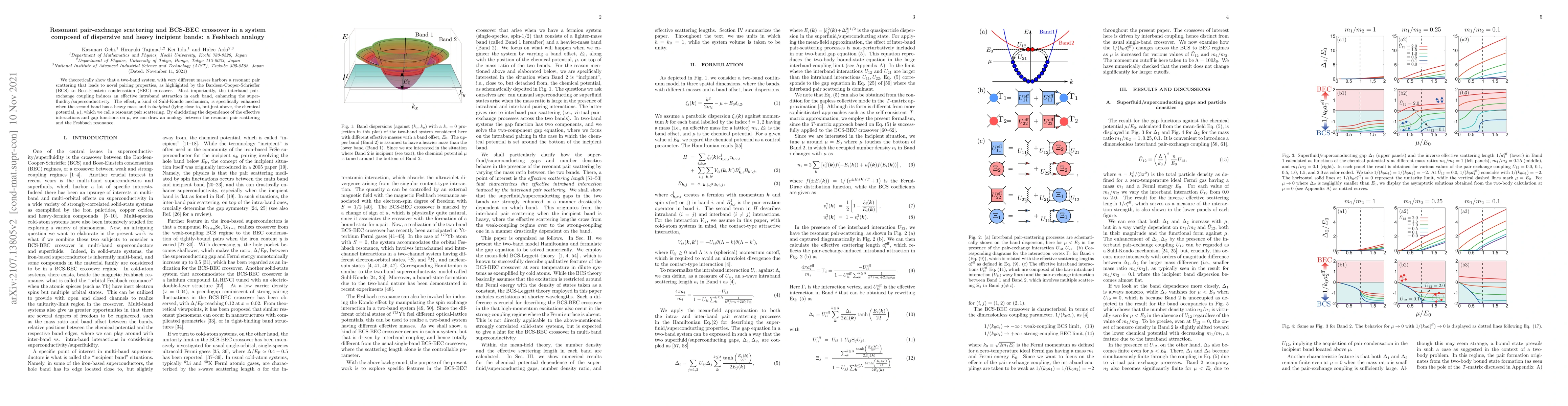 This research demonstrates that a two-band system with significantly different masses exhibits resonant pair scattering, leading to unique pairing properties across the BCS to BEC crossover. This phenomenon, dubbed 'resonant pair scattering,' enhances superfluidity/superconductivity by inducing effective intraband attraction, particularly in a heavy, incipient second band. The paper draws an analogy between this resonant pair scattering and Feshbach resonance, elucidating the relationship between effective interactions and gap functions with the chemical potential, μ.