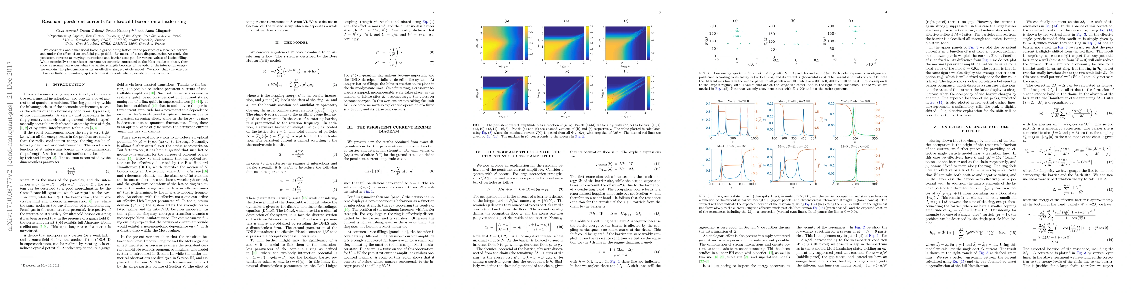 This study investigates resonant persistent currents in a one-dimensional bosonic gas on a ring lattice with a localized barrier and an artificial gauge field. The research reveals that while currents are suppressed in the Mott insulator phase, they exhibit resonant behavior when the barrier strength is comparable to the interaction energy, an effect explained by an effective single-particle model and shown to be robust at finite temperatures.