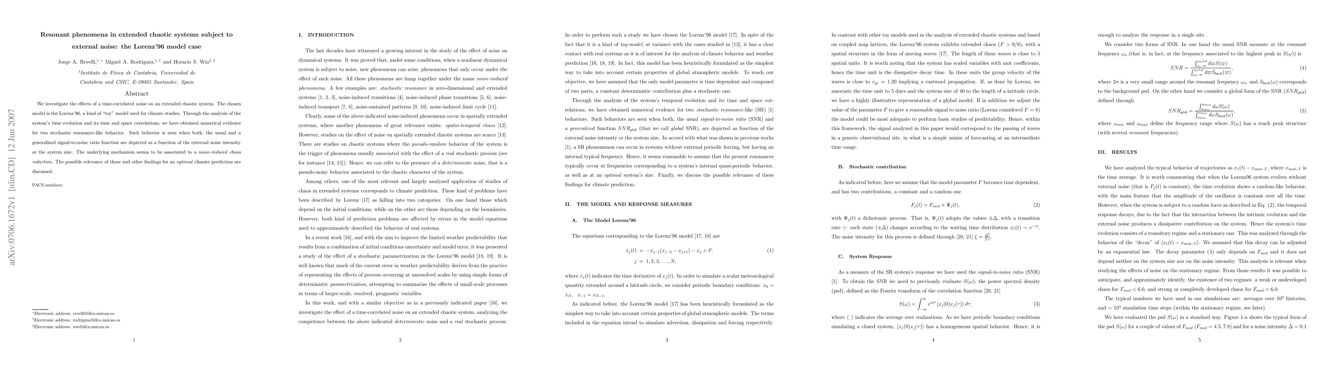 We investigate the effects of a time-correlated noise on an extended chaotic system. The chosen model is the Lorenz'96, a kind of "toy" model used for climate studies. Through the analysis of the system's time evolution and its time and space correlations, we have obtained numerical evidence for two stochastic resonance-like behavior. Such behavior is seen when both, the usual and a generalized signal-to-noise ratio function are depicted as a function of the external noise intensity or the system size. The underlying mechanism seems to be associated to a "noise-induced chaos reduction". The possible relevance of these and other findings for an "optimal" climate prediction are discussed.