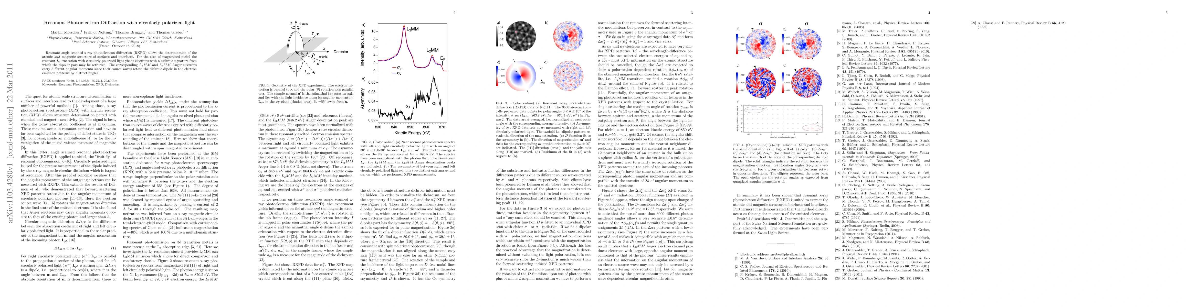 Resonant angle scanned x-ray photoelectron diffraction (RXPD) allows the determination of the atomic and magnetic structure of surfaces and interfaces. For the case of magnetized nickel the resonant L2 excitation with circularly polarized light yields electrons with a dichroic signature from which the dipolar part may be retrieved. The corresponding L2MM and L3MM Auger electrons carry different angular momenta since their source waves rotate the dichroic dipole in the electron emission patterns by distinct angles.