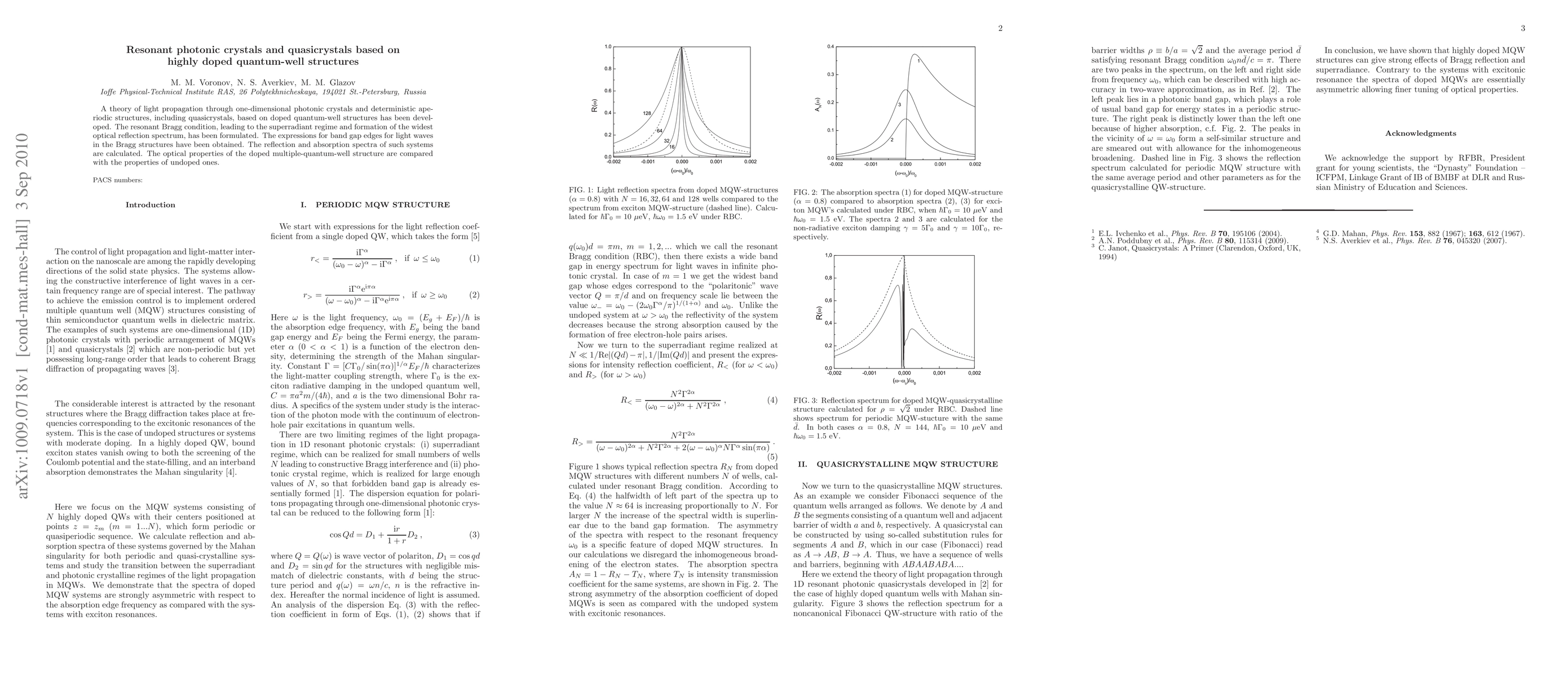 This paper develops a theory for light propagation through one-dimensional photonic crystals and quasicrystals based on doped quantum-well structures, formulating the resonant Bragg condition and calculating the band gap edges, reflection, and absorption spectra, comparing doped and undoped multiple-quantum-well structures.
