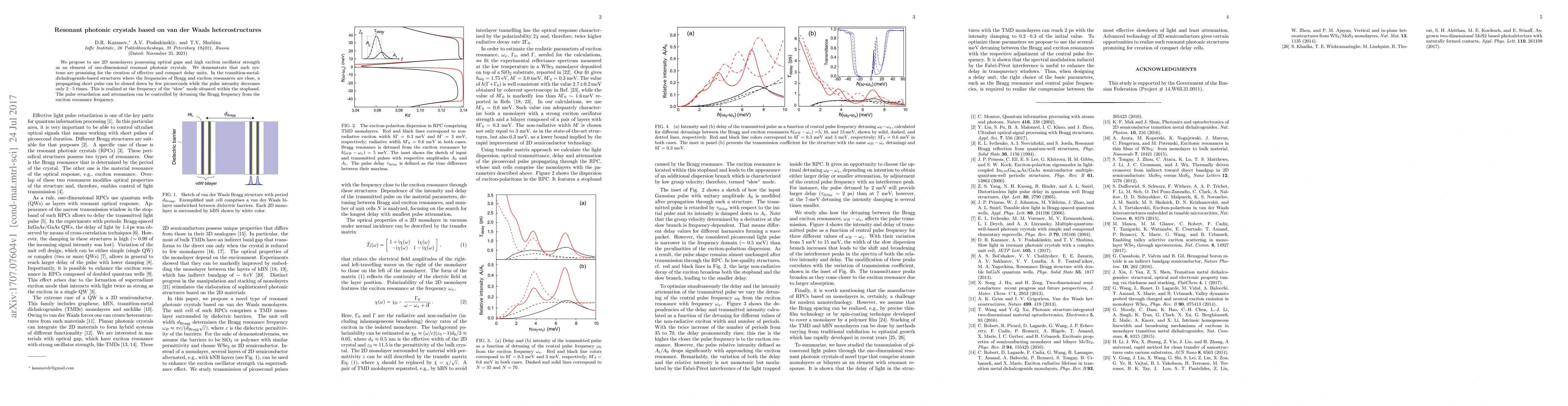 We propose to use 2D monolayers possessing optical gaps and high exciton oscillator strength as an element of one-dimensional resonant photonic crystals. We demonstrate that such systems are promising for the creation of effective and compact delay units. In the transition-metal-dichalcogenide-based structures where the frequencies of Bragg and exciton resonances are close, a propagating short pulse can be slowed down by few picoseconds while the pulse intensity decreases only 2 - 5 times. This is realized at the frequency of the "slow" mode situated within the stopband. The pulse retardation and attenuation can be controlled by detuning the Bragg frequency from the exciton resonance frequency.