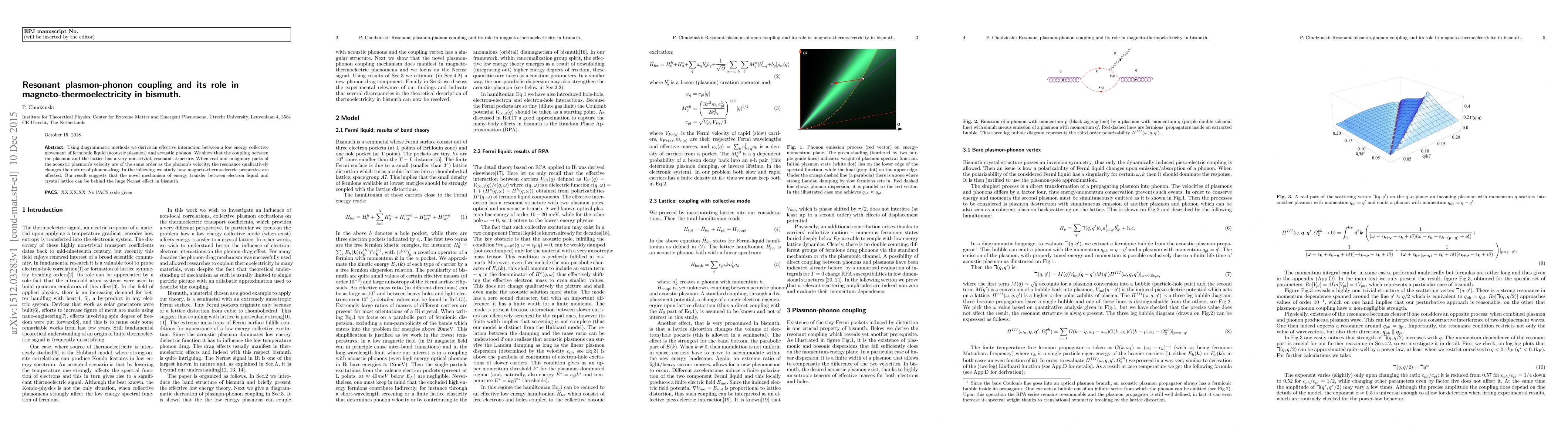 Using diagrammatic methods we derive an effective interaction between a low energy collective movement of fermionic liquid (acoustic plasmon) and acoustic phonon. We show that the coupling between the plasmon and the lattice has a very non-trivial, resonant structure. When real and imaginary parts of the acoustic plasmon's velocity are of the same order as the phonon's velocity, the resonance qualitatively changes the nature of phonon-drag. In the following we study how magneto-thermoelectric properties are affected. Our result suggests that the novel mechanism of energy transfer between electron liquid and crystal lattice can be behind the huge Nernst effect in bismuth.