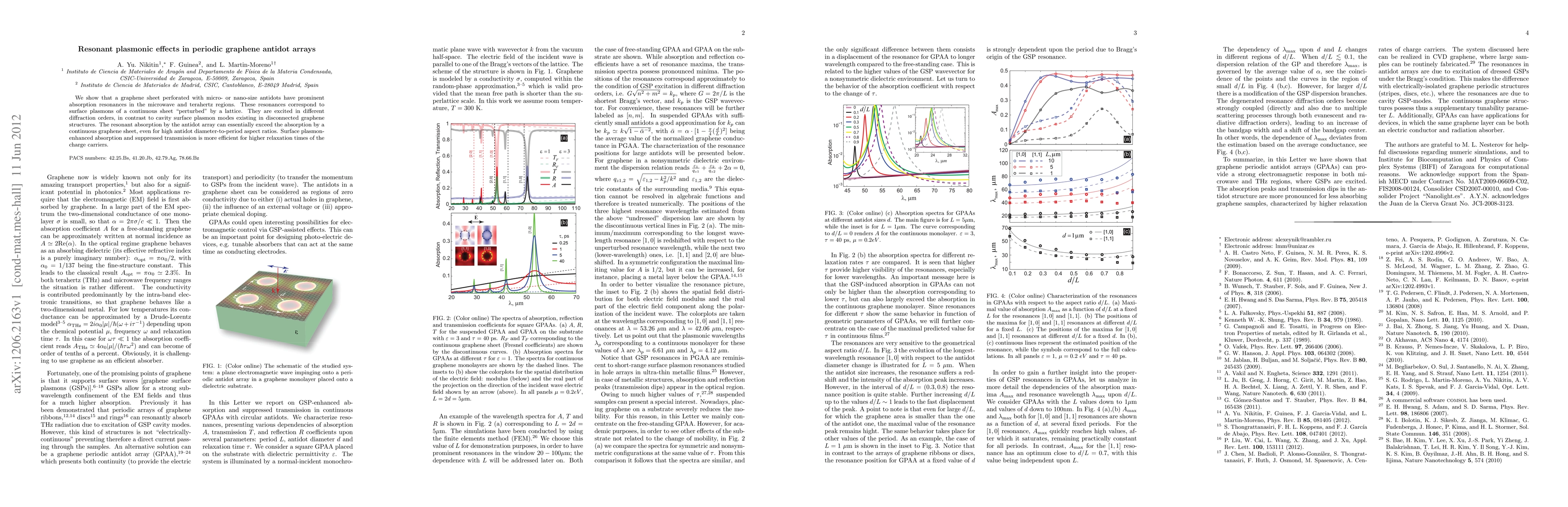 This paper demonstrates that periodic graphene antidot arrays exhibit significant resonant absorption in microwave and terahertz regions due to lattice-perturbed surface plasmons, which can surpass absorption levels of continuous graphene sheets, especially under higher charge carrier relaxation times. The resonances are distinct from cavity modes in disconnected structures, being excited in different diffraction orders.