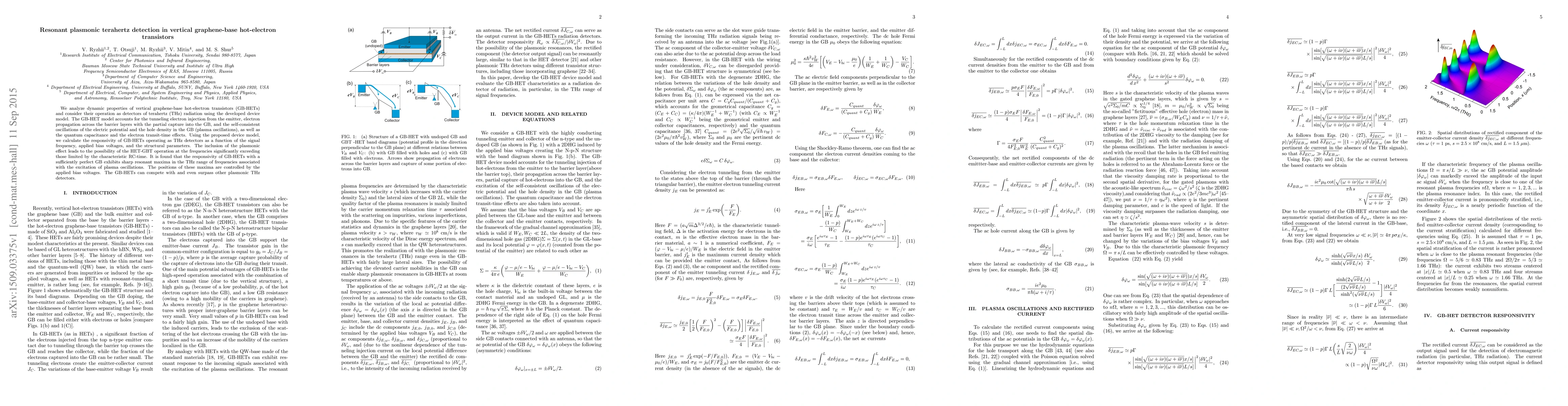 This paper investigates the dynamic properties of vertical graphene-base hot-electron transistors (GB-HETs) and demonstrates their potential as terahertz (THz) detectors. The model highlights resonant plasmonic effects leading to enhanced detection efficiency at frequencies beyond conventional limits.