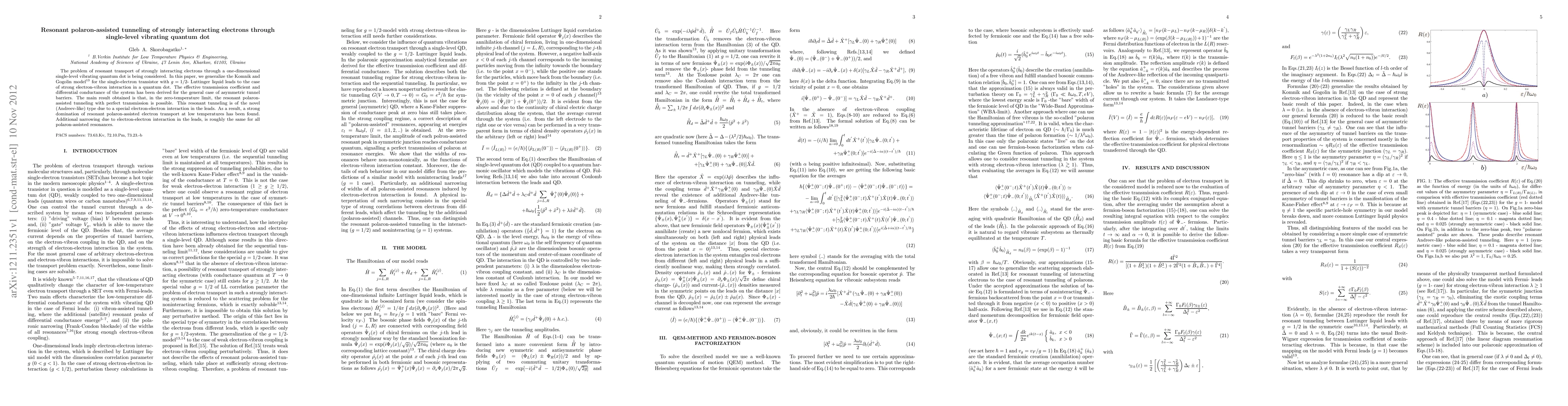 This paper generalizes the Komnik and Gogolin model for electron transport through a single-level vibrating quantum dot, showing that resonant polaron-assisted tunneling can occur with perfect transmission at zero temperature due to strong electron-vibron interaction. The study reveals a novel Andreev-like resonant tunneling driven by electron-electron interactions in the leads.