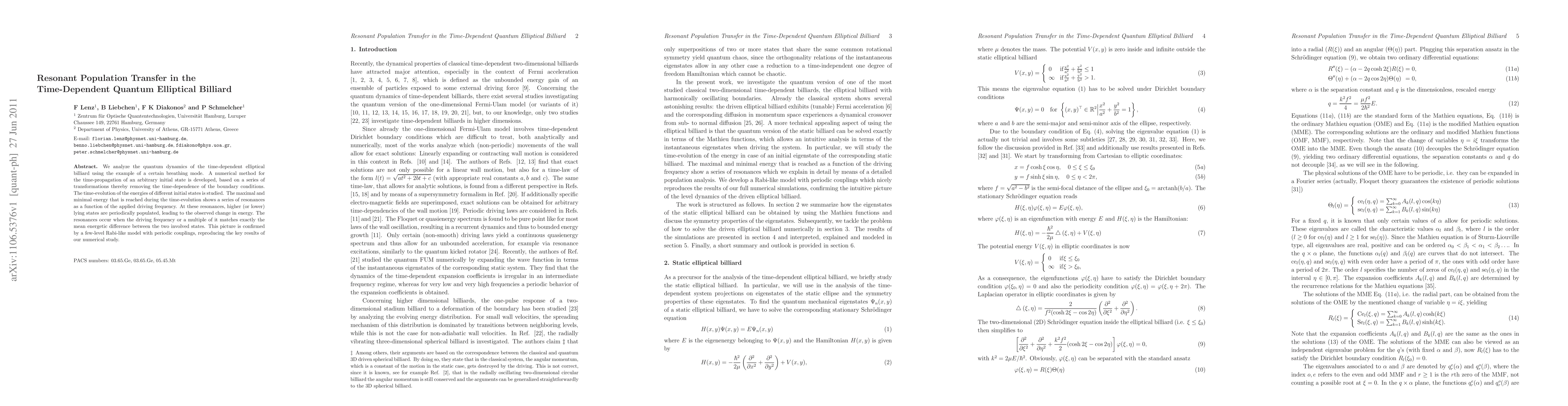 This paper investigates the quantum dynamics of a time-dependent elliptical billiard, focusing on resonant population transfer between energy states driven by a breathing mode. Numerical methods reveal resonances where higher or lower states are periodically populated, matching the driving frequency to the mean energetic difference between states.