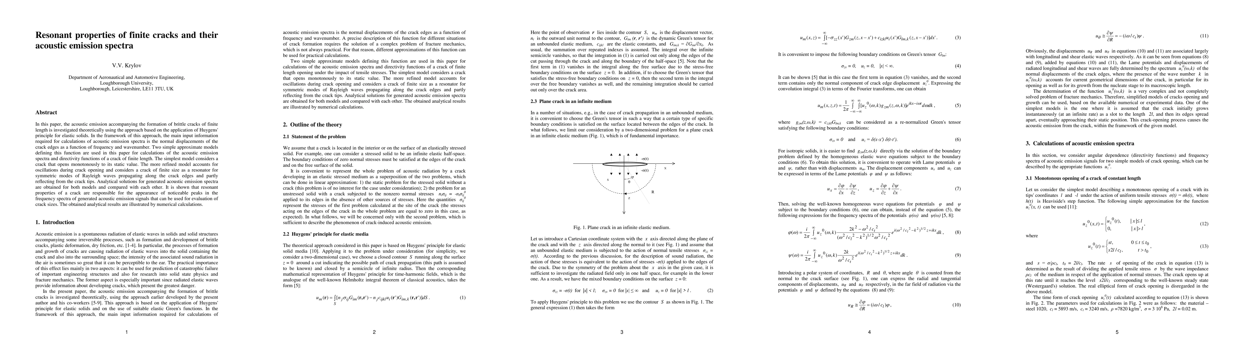This paper investigates the acoustic emission from finite cracks using Huygens' principle, modeling crack edge displacements and deriving spectra for two crack models. Resonant properties of cracks are shown to create peaks in acoustic emission spectra, aiding in crack size evaluation.