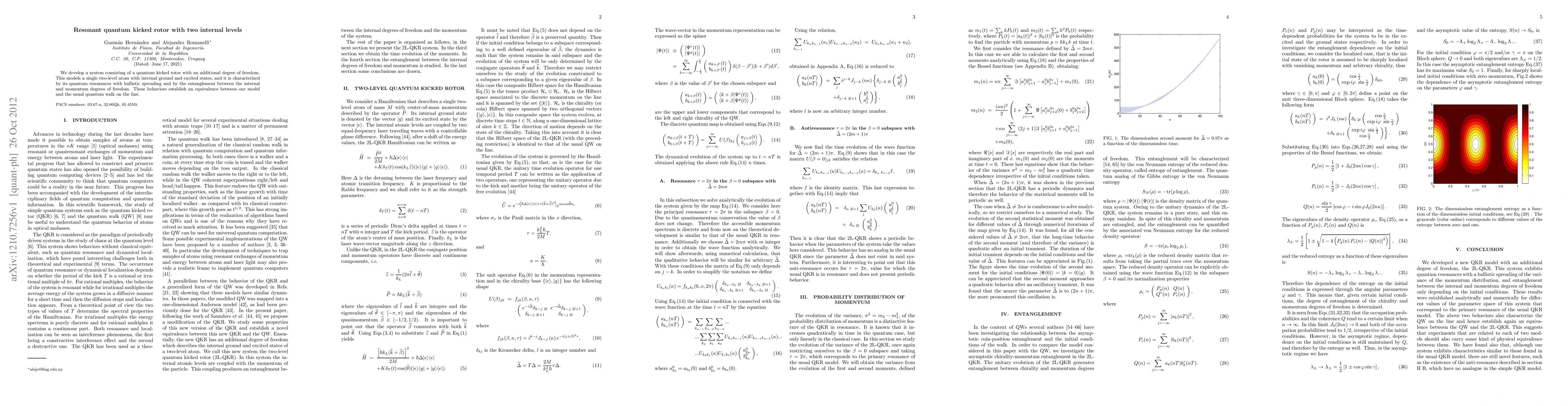 This paper explores a quantum kicked rotor with two internal levels, modeling a two-level atom, and investigates its quantum resonances, ballistic spreading, and entanglement, establishing a parallel to the quantum walk on a line.