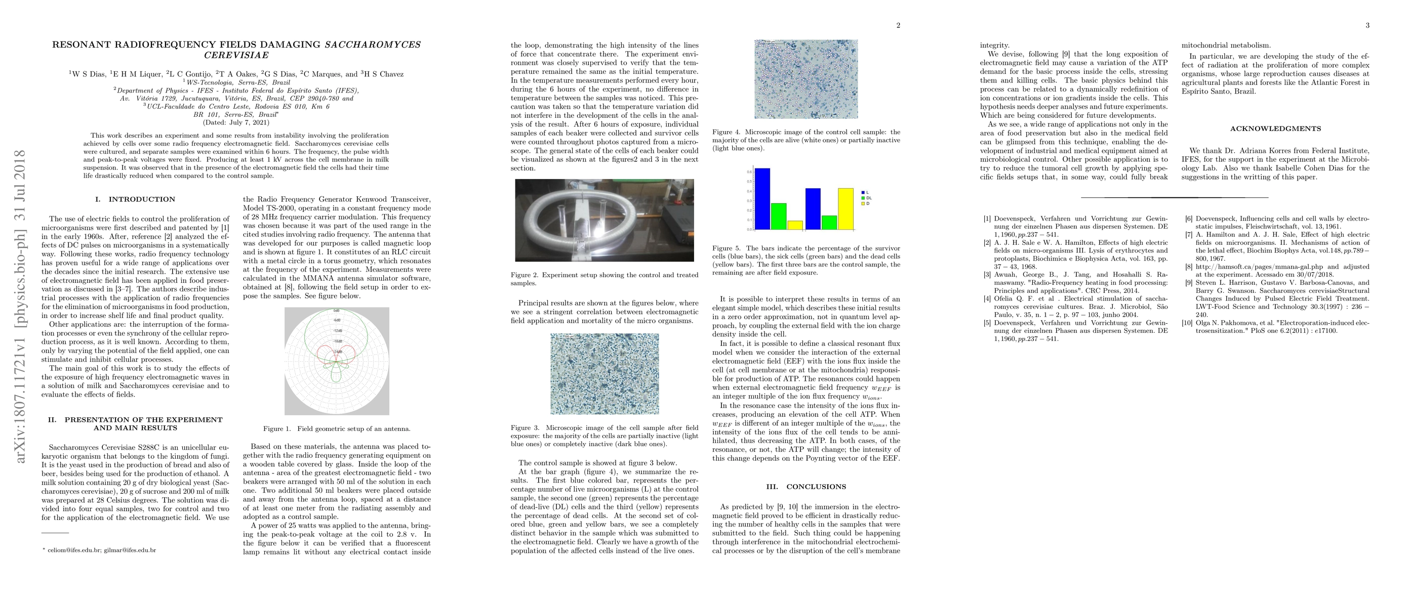 This work describes an experiment and some results from instability involving the proliferation achieved by cells over some radio frequency electromagnetic field. Saccharomyces cerevisiae cells were cultured, and separate samples were examined within 6 hours. The frequency, the pulse width and peak-to-peak voltages were fixed. Producing at least 1 kV across the cell membrane in milk suspension. It was observed that in the presence of the electromagnetic field the cells had their time life drastically reduced when compared to the control sample.
