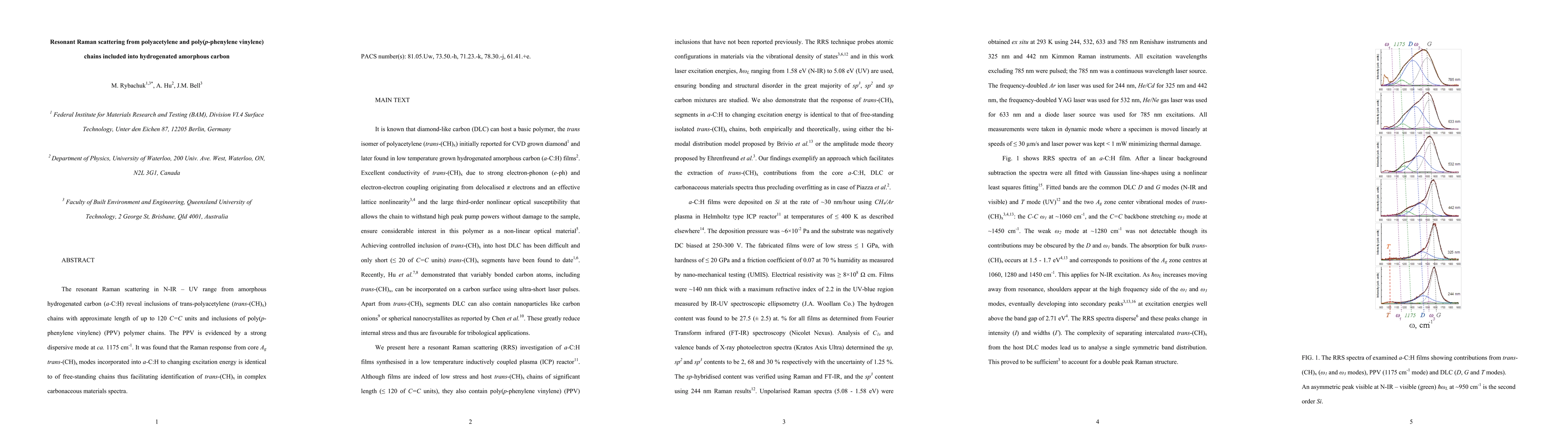 The research identifies trans-polyacetylene chains up to 120 C=C units long and poly(p-phenylene vinylene) polymer chains within hydrogenated amorphous carbon using resonant Raman scattering. The methodology confirms these inclusions by observing their Raman response, which matches that of free-standing chains, aiding in trans-(CH)x identification in complex carbonaceous materials.