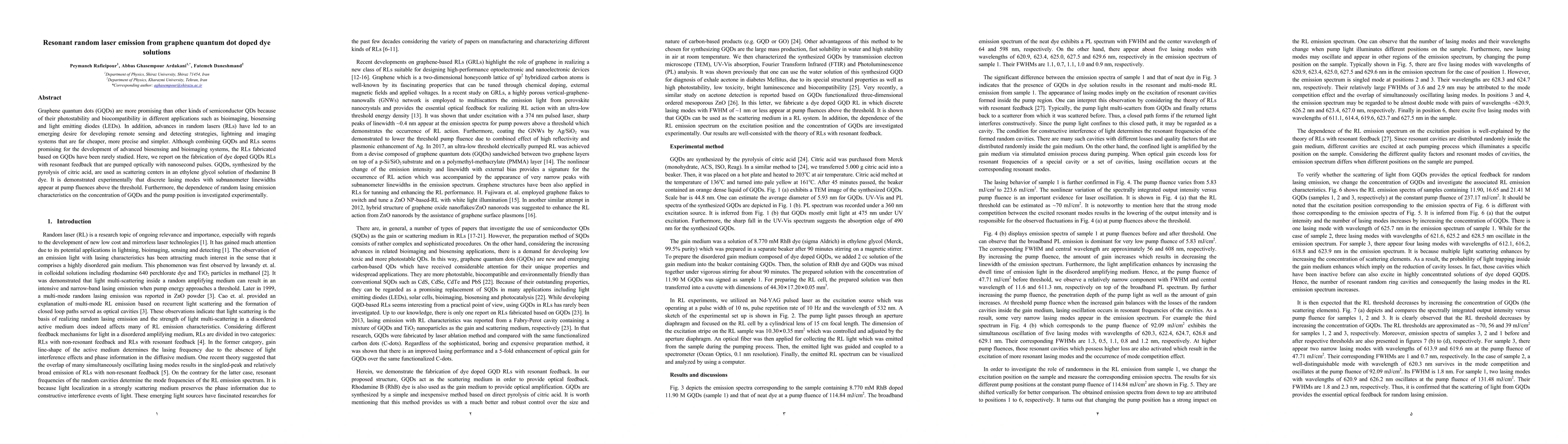 Graphene quantum dots (GQDs) are more promising than other kinds of semiconductor QDs because of their photostability and biocompatibility in different applications such as bioimaging, biosensing and light emitting diodes (LEDs). In addition, advances in random lasers (RLs) have led to an emerging desire for developing remote sensing and detecting strategies, lightning and imaging systems that are far cheaper, more precise and simpler. Although combining GQDs and RLs seems promising for the development of advanced biosensing and bioimaging systems, the RLs fabricated based on GQDs have been rarely studied. Here, we report on the fabrication of dye doped GQDs RLs with resonant feedback that are pumped optically with nanosecond pulses. GQDs, synthesized by the pyrolysis of citric acid, are used as scattering centers in an ethylene glycol solution of rhodamine B dye. It is demonstrated experimentally that discrete lasing modes with subnanometer linewidths appear at pump fluences above the threshold. Furthermore, the dependence of random lasing emission characteristics on the concentration of GQDs and the pump position is investigated experimentally.