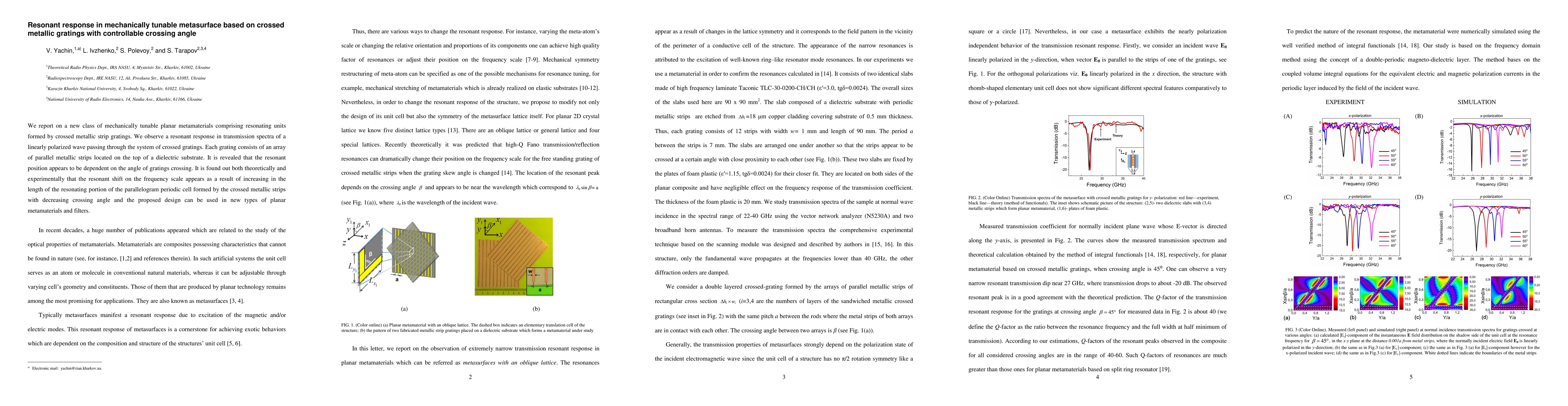 This paper introduces a mechanically tunable metasurface made from crossed metallic gratings, demonstrating a resonant response in transmission spectra that shifts with the angle of grating crossing. The design allows for frequency tuning by adjusting the crossing angle, offering potential for new planar metamaterials and filters.