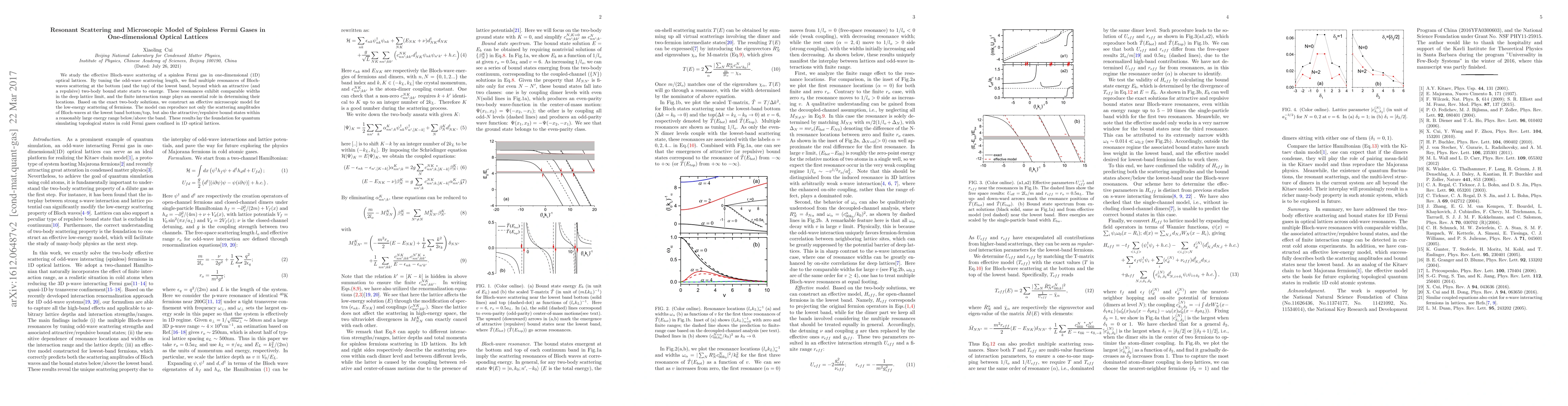 This paper investigates resonant scattering in spinless Fermi gases within one-dimensional optical lattices, revealing multiple Bloch-wave scattering resonances that lead to attractive and repulsive bound states. An effective microscopic model based on exact two-body solutions accurately reproduces the scattering amplitudes and bound states, providing a foundation for quantum simulations of topological states in these systems.