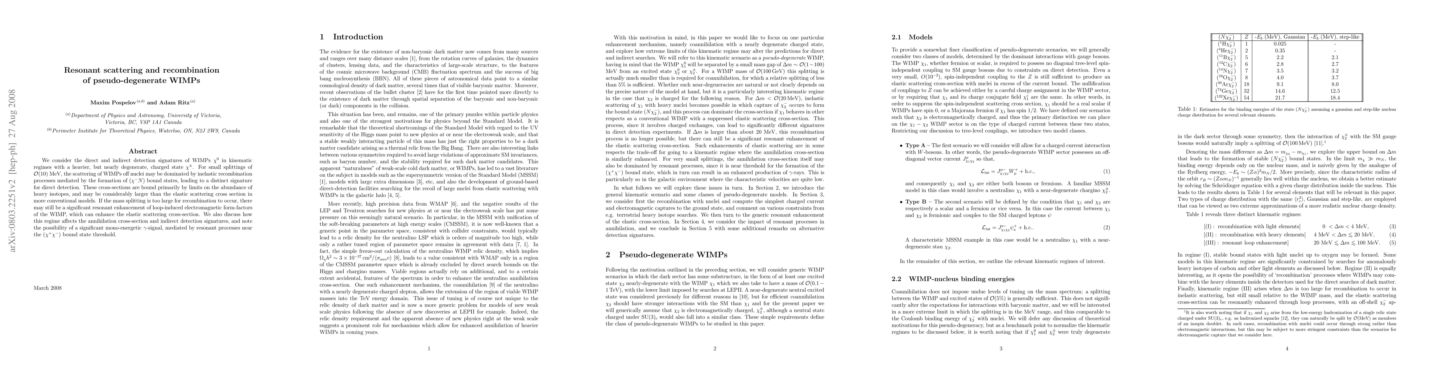 We consider the direct and indirect detection signatures of WIMPs \chi^0 in kinematic regimes with a heavier, but nearly degenerate, charged state \chi^{+-}. For small splittings of O(10) MeV, the scattering of WIMPs off nuclei may be dominated by inelastic recombination processes mediated by the formation of (\chi^- N) bound states, leading to a distinct signature for direct detection. These cross-sections are bound primarily by limits on the abundance of heavy isotopes, and may be considerably larger than the elastic scattering cross section in more conventional models. If the mass splitting is too large for recombination to occur, there may still be a significant resonant enhancement of loop-induced electromagnetic form-factors of the WIMP, which can enhance the elastic scattering cross-section. We also discuss how this regime affects the annihilation cross-section and indirect detection signatures, and note the possibility of a significant mono-energetic \gamma-signal, mediated by resonant processes near the (\chi^+\chi^-) bound state threshold.