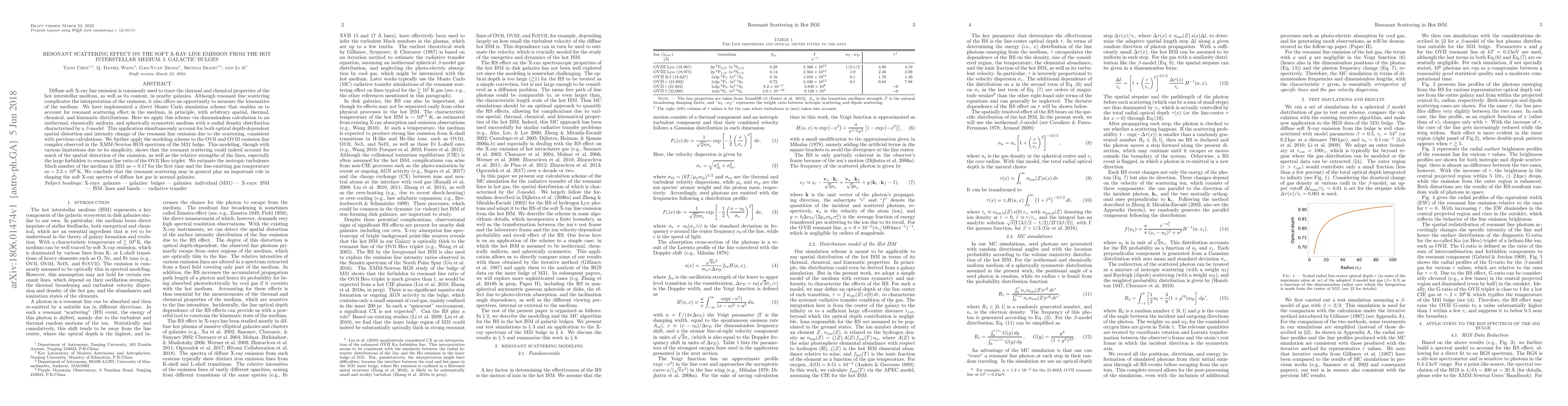 This paper investigates the resonant scattering effect on soft X-ray line emission from the hot interstellar medium in galactic bulges, using a Monte Carlo simulation. The study finds that resonant scattering significantly distorts the spatial distribution and intensity of the emission, particularly affecting the OVII and OVIII lines in M31, and estimates the turbulence Mach number and gas temperature in the medium.