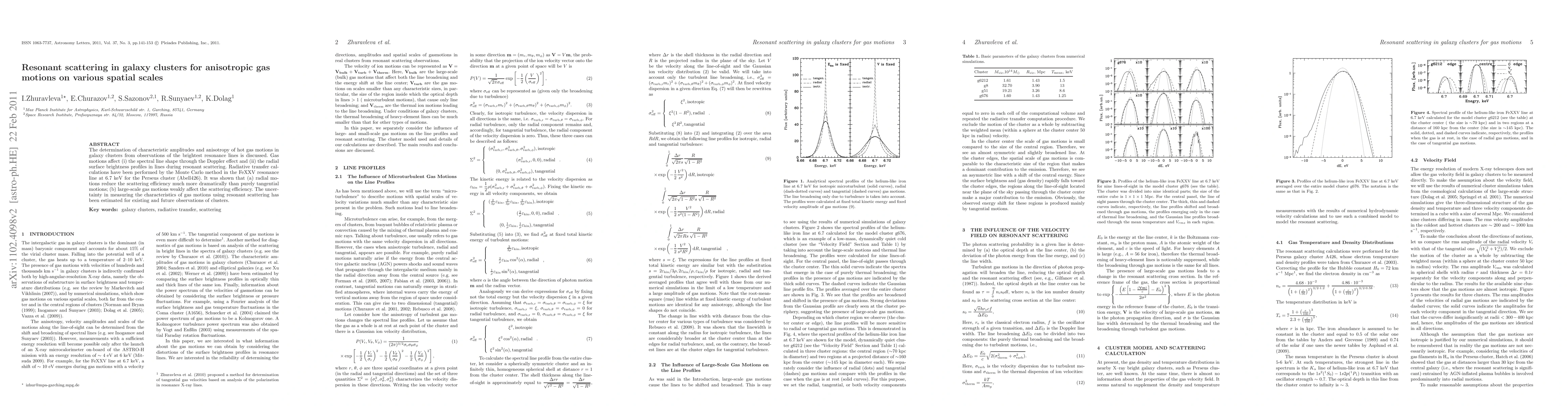 The determination of characteristic amplitudes and anisotropy of hot gas motions in galaxy clusters from observations of the brightest resonance lines is discussed. Gas motions affect (i) the spectral line shape through the Doppler effect and (ii) the radial surface brightness profiles in lines during resonant scattering. Radiative transfer calculations have been performed by the Monte Carlo method in the FeXXV resonance line at 6.7 eV for the Perseus cluster (Abell426). It was shown that (a) radial motions reduce the scattering efficiency much more dramatically than purely tangential motions; (b) large-scale gas motions weakly affect the scattering efficiency. The uncertainty in measuring the characteristics of gas motions using resonant scattering has been estimated for existing and future observations of clusters.