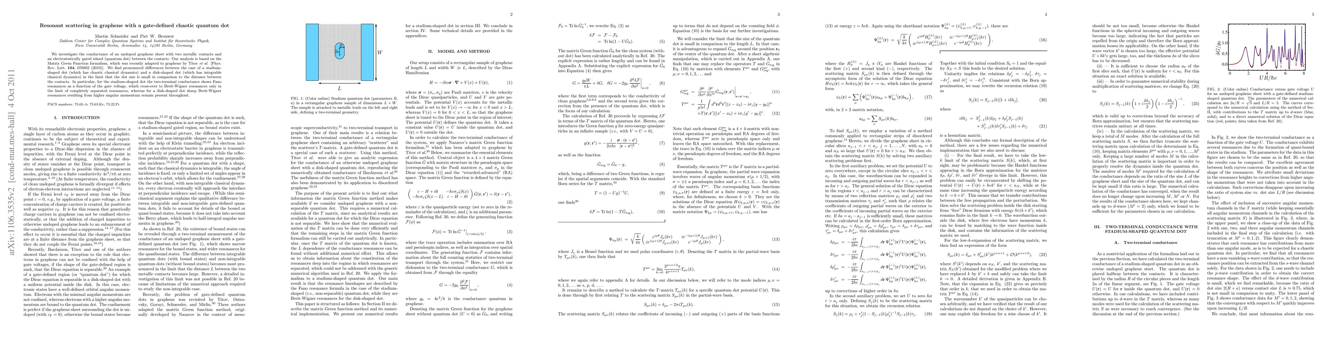 We investigate the conductance of an undoped graphene sheet with two metallic contacts and an electrostatically gated island (quantum dot) between the contacts. Our analysis is based on the Matrix Green Function formalism, which was recently adapted to graphene by Titov {\em et al.} [Phys.\ Rev.\ Lett.\ {\bf 104}, 076802 (2010)]. We find pronounced differences between the case of a stadium-shaped dot (which has chaotic classical dynamics) and a disc-shaped dot (which has integrable classical dynamics) in the limit that the dot size is small in comparison to the distance between the contacts. In particular, for the stadium-shaped dot the two-terminal conductance shows Fano resonances as a function of the gate voltage, which cross-over to Breit-Wigner resonances only in the limit of completely separated resonances, whereas for a disc-shaped dot sharp Breit-Wigner resonances resulting from higher angular momentum remain present throughout.
