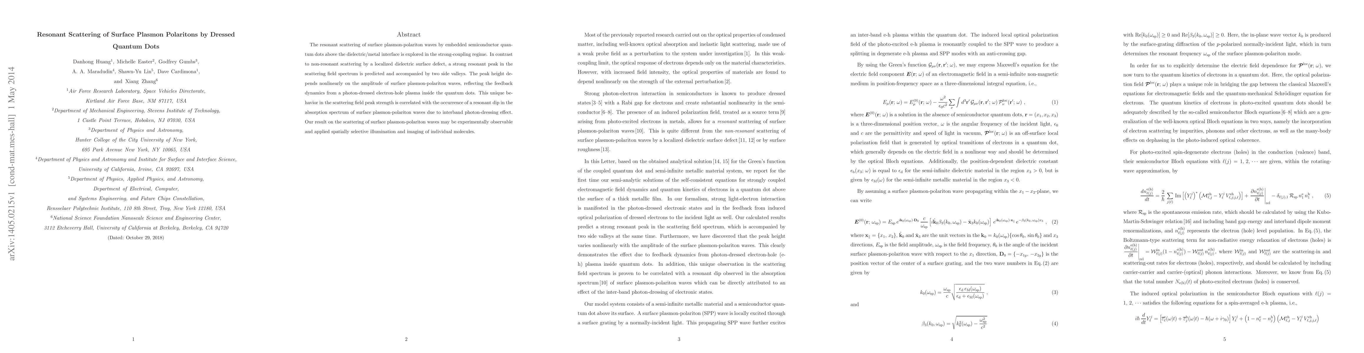 The paper investigates the resonant scattering of surface plasmon-polaritons by semiconductor quantum dots, predicting a strong scattering peak and side valleys, and linking this behavior to feedback dynamics within the quantum dots. The phenomenon may enable spatially selective illumination and imaging of molecules.