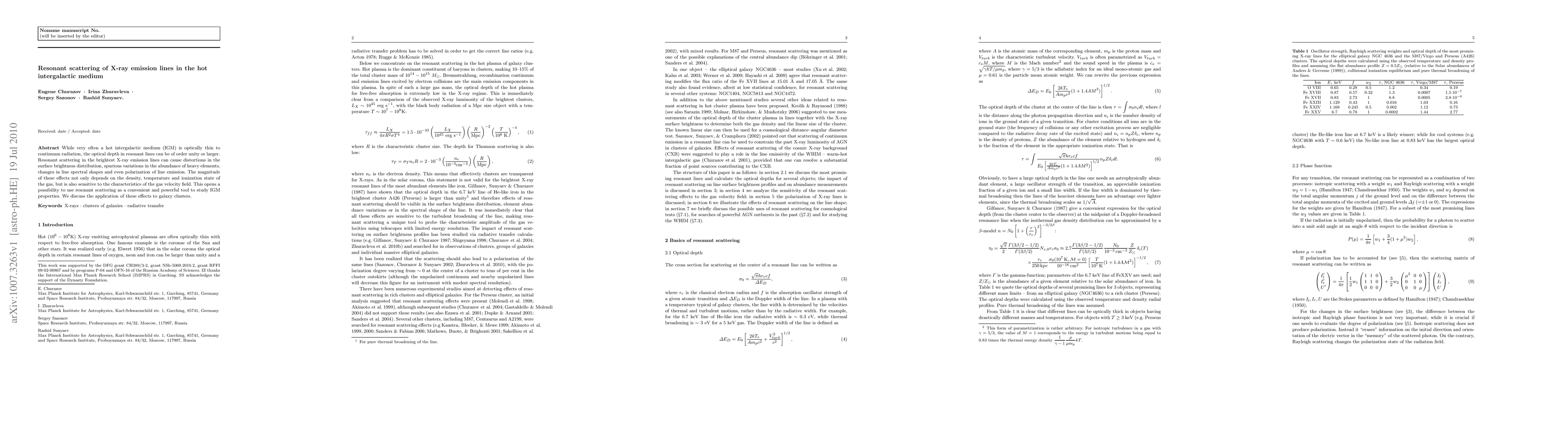 While very often a hot intergalactic medium (IGM) is optically thin to continuum radiation, the optical depth in resonant lines can be of order unity or larger. Resonant scattering in the brightest X-ray emission lines can cause distortions in the surface brightness distribution, spurious variations in the abundance of heavy elements, changes in line spectral shapes and even polarization of line emission. The magnitude of these effects not only depends on the density, temperature and ionization state of the gas, but is also sensitive to the characteristics of the gas velocity field. This opens a possibility to use resonant scattering as a convenient and powerful tool to study IGM properties. We discuss the application of these effects to galaxy clusters.