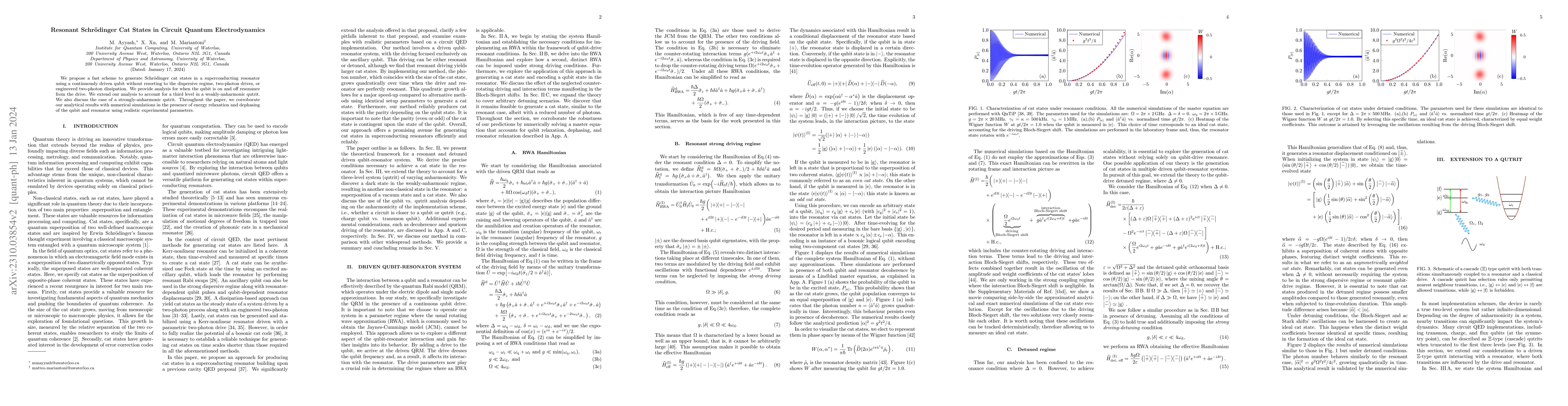 We propose a fast scheme to generate Schr\"odinger cat states in a superconducting resonator using a continuously driven qubit without resorting to the dispersive regime, two-photon drives, or engineered two-photon dissipation. We provide analysis for when the qubit is on and off resonance from the drive. We extend our analysis to account for a third level in a weakly-anharmonic qutrit. We also discuss the case of a strongly-anharmonic qutrit. Throughout the paper, we corroborate our analytical results with numerical simulations in the presence of energy relaxation and dephasing of the qubit and resonator using realistic experimental parameters.