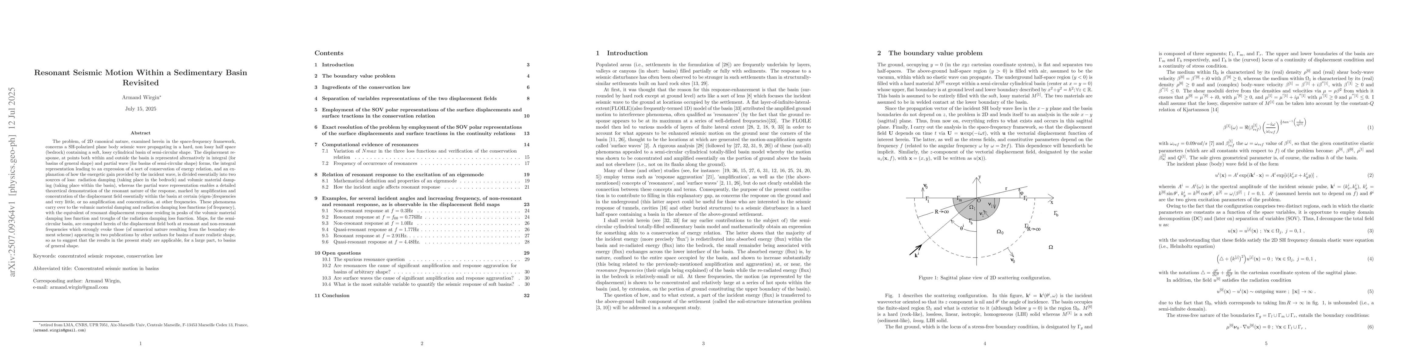 The problem, of 2D canonical nature, examined herein in the space-frequency framework, concerns a SH-polarized plane body seismic wave propagating in a hard, non lossy half space (bedrock) containing a soft, lossy cylindrical basin of semi-circular shape. The displacement response, at points both within and outside the basin is represented alternatively in integral (for basins of general shape) and partial wave (for basins of semi-circular shape) forms, the integral representation leading to an expression of a sort of conservation of energy relation, and an explanation of how the energetic gain provided by the incident wave, is divided essentially into two sources of loss: radiation damping (taking place in the bedrock) and volumic material damping (taking place within the basin), whereas the partial wave representation enables a detailed theoretical demonstration of the resonant nature of the response, marked by amplification and concentration of the displacement field essentially within the basin at certain (eigen-)frequencies and very little, or no amplification and concentration, at other frequencies. These phenomena carry over to the volumic material damping and radiation damping loss functions (of frequency), with the equivalent of resonant displacement response residing in peaks of the volumic material damping loss function and troughs of the radiation damping loss function. Maps, for the semi-circular basin, are computed herein of the displacement field both at resonant and non-resonant frequencies which strongly evoke those (of numerical nature resulting from the boundary element scheme) appearing in two publications by other authors for basins of more realistic shape, so as to suggest that the results in the present study are applicable, for a large part, to basins of general shape.