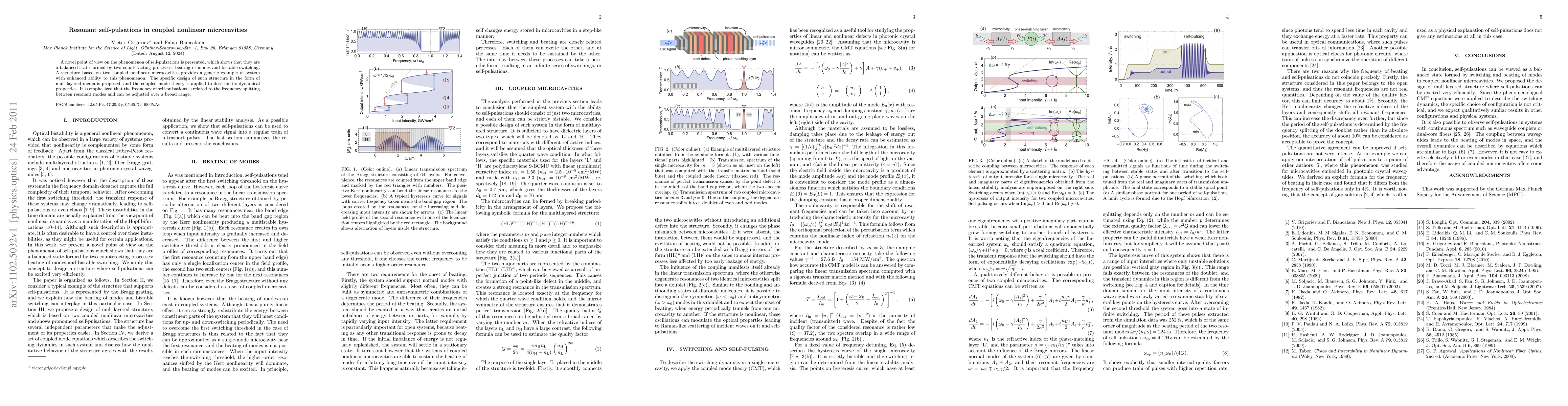 This paper explores self-pulsations in coupled nonlinear microcavities, revealing they arise from a balance between mode beating and bistable switching. A proposed multilayered structure demonstrates enhanced self-pulsation capabilities, with its dynamics described using coupled mode theory, and adjustable pulsation frequency linked to mode frequency splitting.