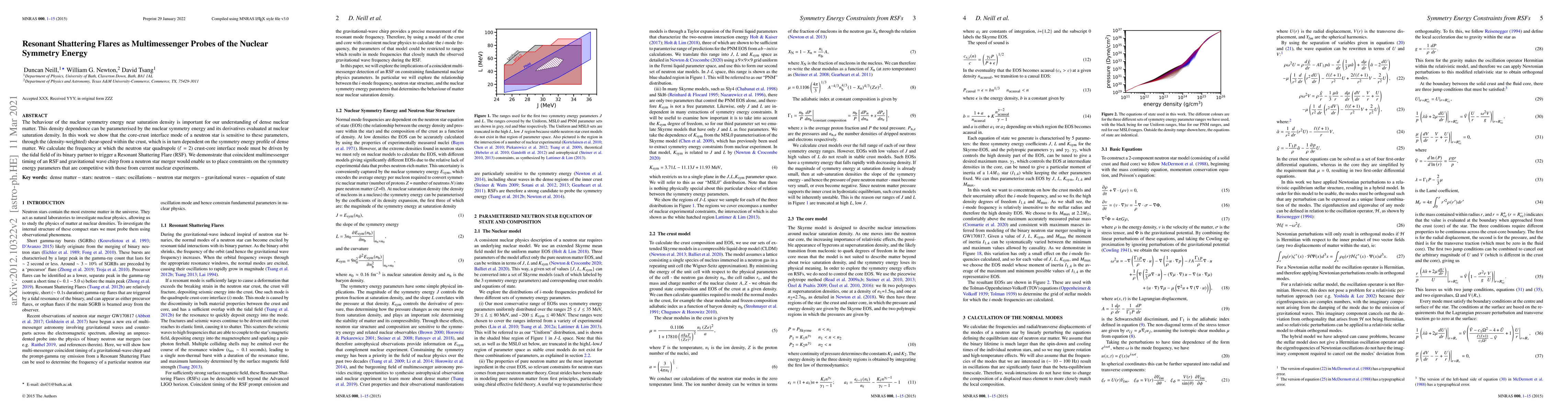 This paper investigates how resonant shattering flares (RSFs) in neutron stars can provide insights into the nuclear symmetry energy near saturation density. It demonstrates that the core-crust interface mode's frequency, driven by the tidal field of a binary partner, is sensitive to the symmetry energy profile, thus offering a multimessenger probe to constrain nuclear symmetry energy parameters, rivaling current nuclear experiments.