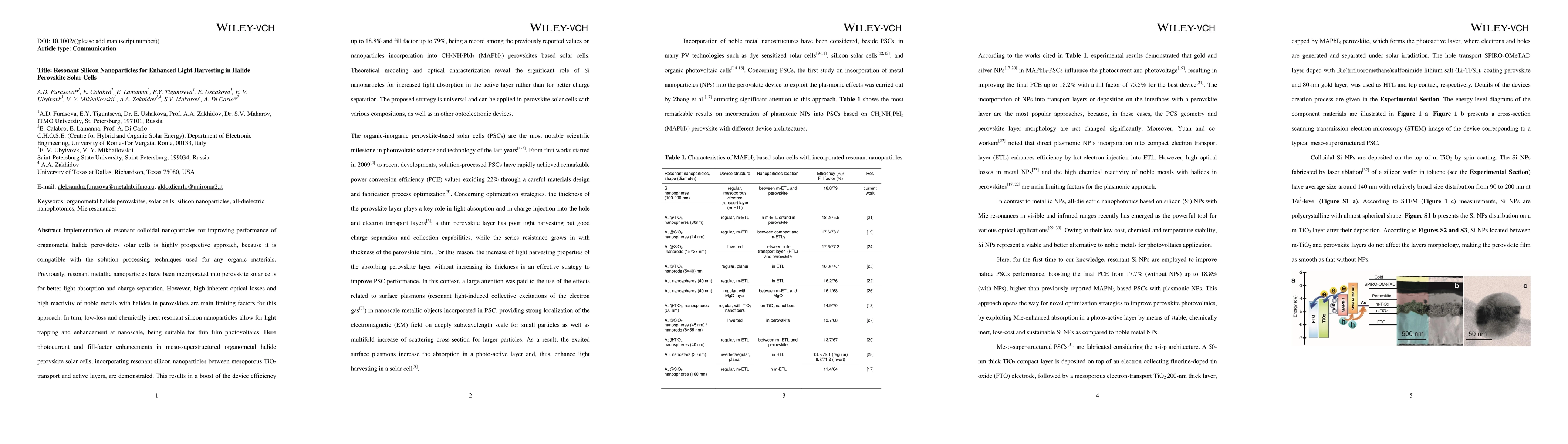 This paper demonstrates that incorporating resonant silicon nanoparticles into meso-superstructured organometal halide perovskite solar cells enhances light absorption, resulting in a record efficiency of 18.8% and a fill factor of 79%. The use of silicon nanoparticles addresses the optical loss and reactivity issues associated with noble metals, offering a universal approach applicable to various perovskite compositions and optoelectronic devices.