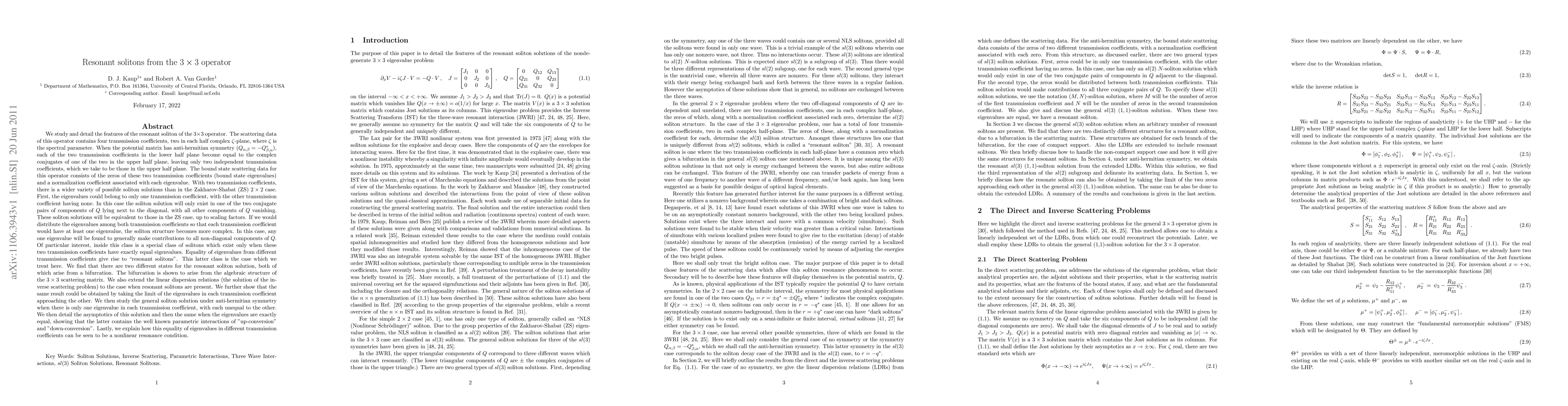 Resonant solitons of the $3\times 3$ operator are studied. The scattering data of this operator contains four transmission coefficients, two in each half complex $\zeta$-plane, where $\zeta$ is the spectral parameter. For anti-hermitian symmetry of the potential, the two transmission coefficients in the lower half plane (LHP) become equal to the complex conjugates of those in the upper half plane (UHP). The bound state scattering data for this operator consists in part of the zeros of these two transmission coefficients. Of particular interest is that class of soliton solutions when the two transmission coefficients have exactly equal eigenvalues, which gives rist to "resonant solitons". They arise from a bifurcation which is caused by the algebraic structure of the $3\times 3$ scattering matrix. We detail the asymptotics of this solution, showing that the latter contains the well known parametric interactions of "up-conversion" and "down-conversion". Lastly, we explain how this equality of eigenvalues in different transmission coefficients can be seen to be a nonlinear resonance condition.