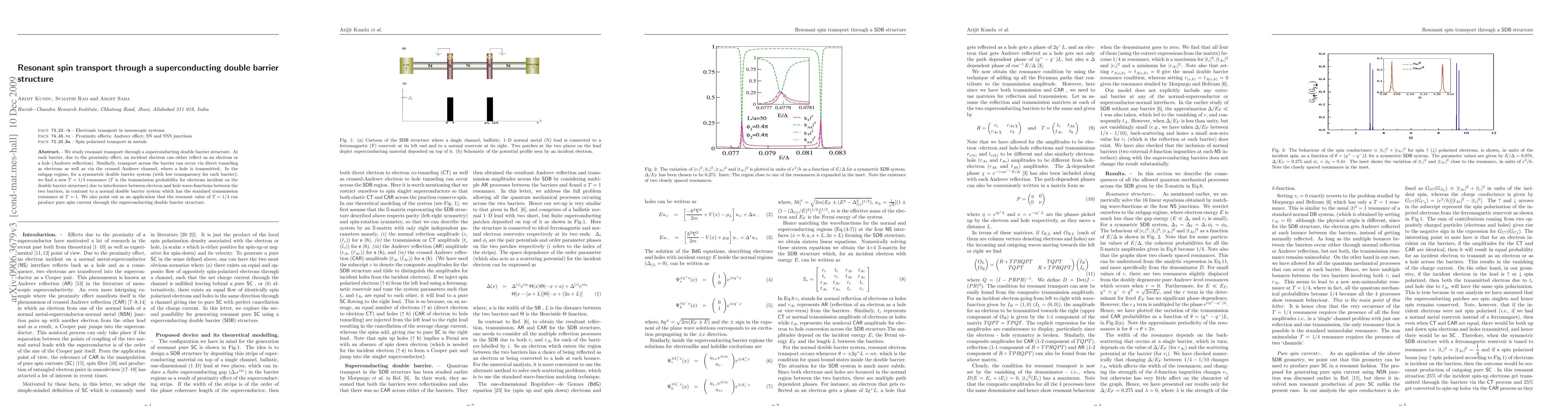 This paper investigates resonant spin transport through a superconducting double barrier structure, revealing a new T=1/4 transmission probability resonance due to interference between electron and hole wave-functions. This unique resonance can generate pure spin current, contrasting with the standard T=1 resonance in typical double barrier systems.