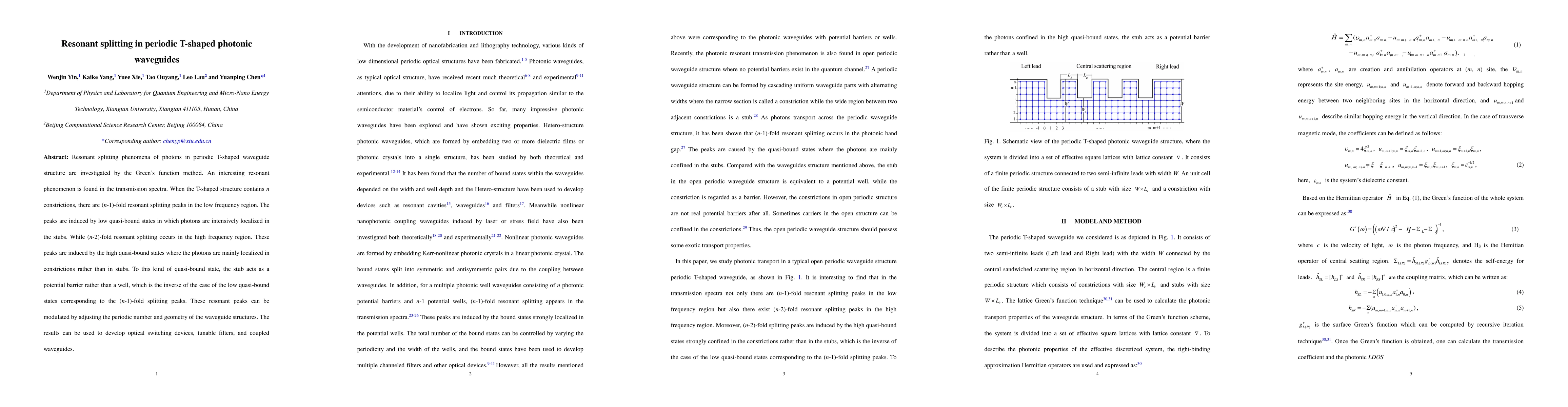 This paper investigates resonant splitting in periodic T-shape photonic waveguides using the Green's function method, revealing (n-1)-fold splitting at low frequencies and (n-2)-fold splitting at high frequencies due to quasi-bound states localized in waveguide constrictions. The stub acts as a potential barrier for high-frequency states, contrasting with low-frequency states.
