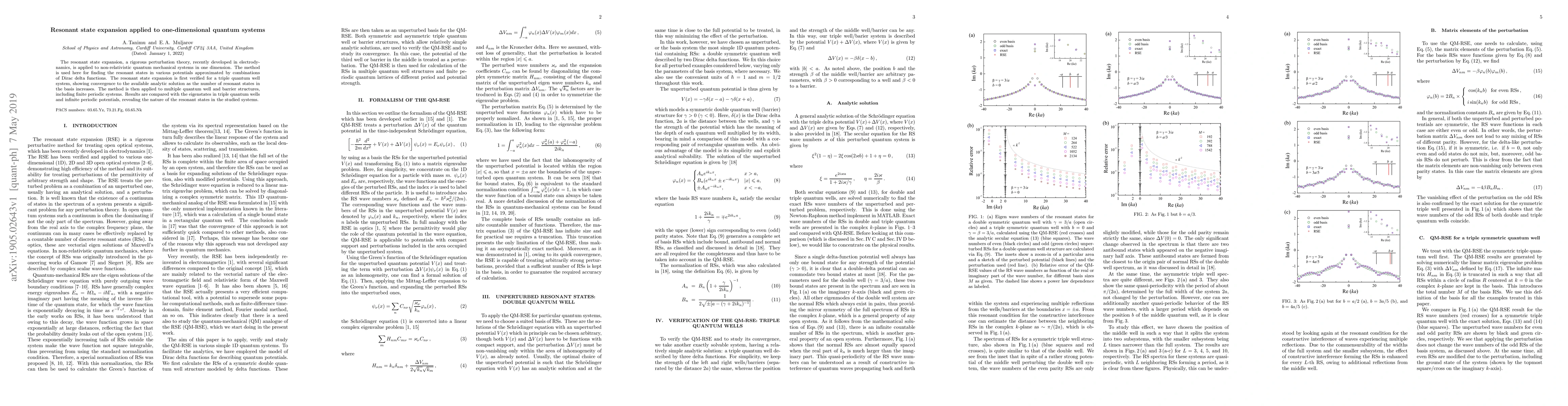 The resonant state expansion, a rigorous perturbation theory, recently developed in electrodynamics, is applied to non-relativistic quantum mechanical systems in one dimension. The method is used here for finding the resonant states in various potentials approximated by combinations of Dirac delta functions. The resonant state expansion is first verified for a triple quantum well system, showing convergence to the available analytic solution as the number of resonant states in the basis increases. The method is then applied to multiple quantum well and barrier structures, including finite periodic systems. Results are compared with the eigenstates in triple quantum wells and infinite periodic potentials, revealing the nature of the resonant states in the studied systems.