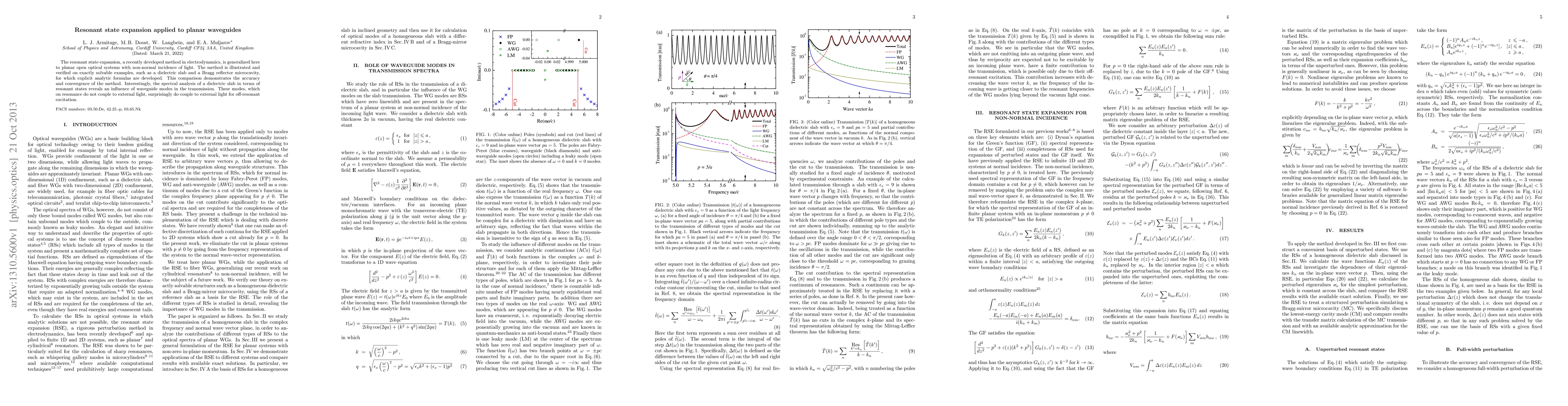This paper generalizes the resonant state expansion method to planar waveguides with non-normal incidence, demonstrating its accuracy and convergence through examples like dielectric slabs and Bragg reflector microcavities. It reveals that waveguide modes, which do not couple to external light on resonance, surprisingly do so for off-resonant excitation.
