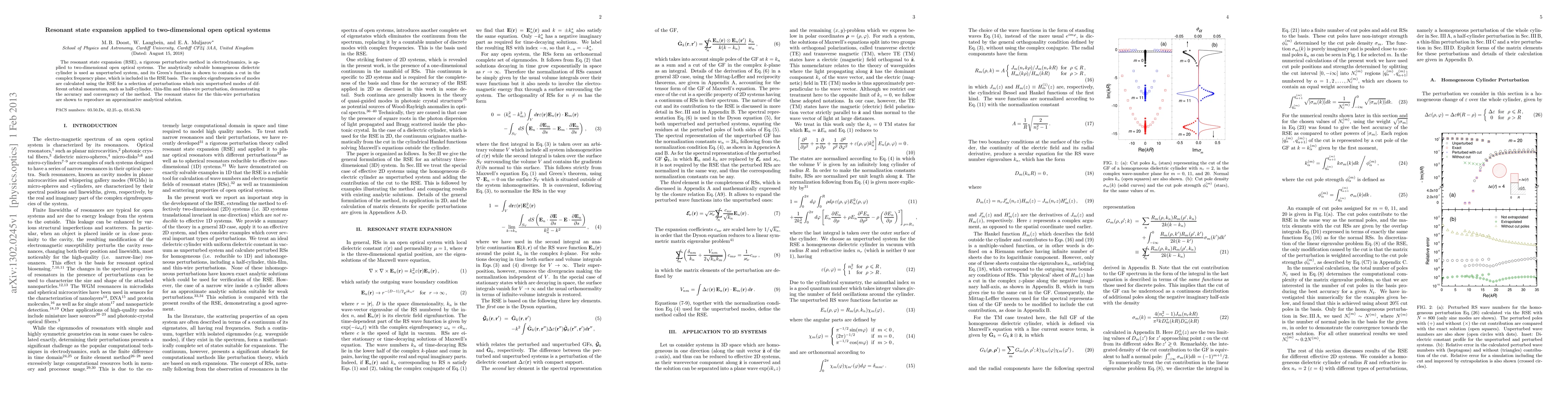 This paper applies the resonant state expansion (RSE) to two-dimensional open optical systems, using a homogeneous dielectric cylinder as a baseline. The RSE method accurately calculates complex eigenfrequencies for various perturbations, demonstrating its effectiveness and convergence in mixing different orbital momentum modes.